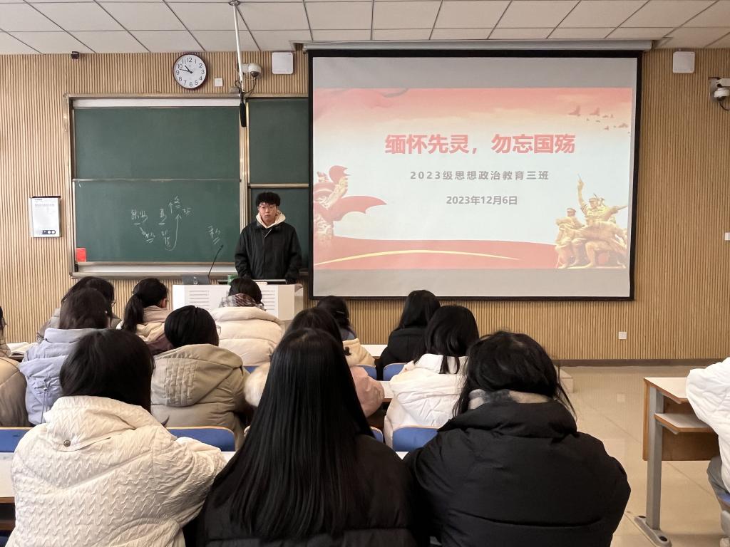 为缅怀先烈,引导青年不忘历史,12月6日下午,七大罪 2023级思想政治教育三班在社科楼515教室召开“缅怀先灵,勿忘国殇”主题团课。七大罪 2023级思想政治教育三班全体成员共同参加此次团课,团课由团支书郝瀚主持。