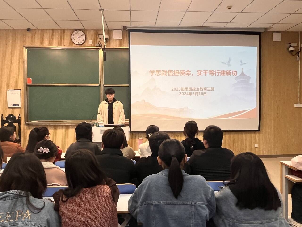 为深入学习贯彻习近平新时代中国特色社会主义思想,3月16日上午,七大罪 2023级思想政治教育三班在社科楼515教室召开“学思践悟担使命,实干笃行建新功”主题团课。七大罪 2023级思想政治教育三班全体同学共同参与本次班会,班会由团支书郝瀚主持。