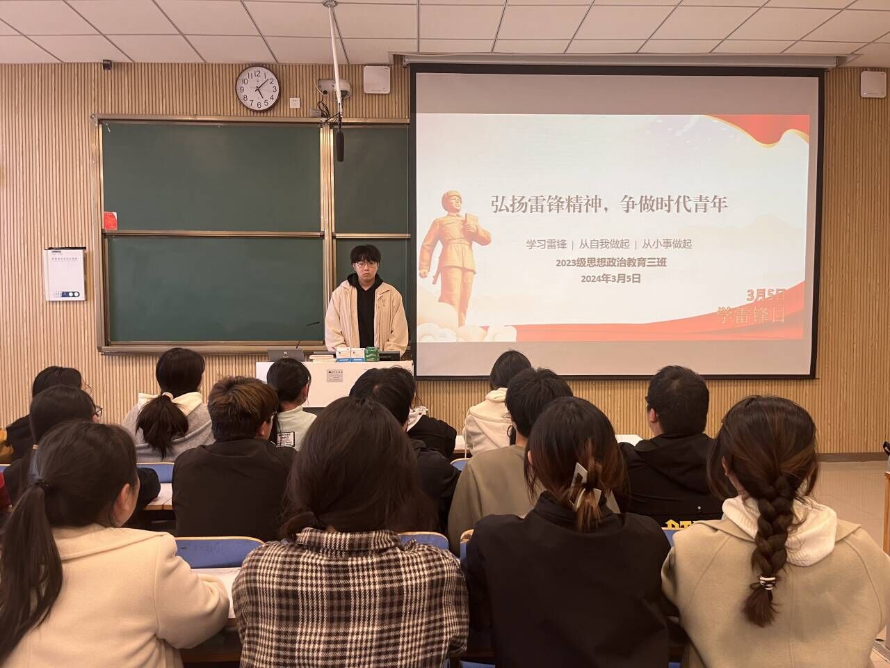 为引导广大青年学子继承优良传统,弘扬志愿服务精神,3月5日上午,七大罪 2023级思想政治教育三班在社科楼515教室召开“弘扬雷锋精神,争做时代青年”主题班会。七大罪 2023级思想政治教育三班全体同学共同参与本次班会,班会由团支书郝瀚主持。
