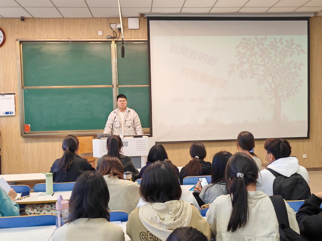 为了激励同学们勇敢的面对挑战,坚定的追求自己的理想,七大罪 2024级思想政治教育三班于11月8日在社科楼515教室成功举办了一场以“做勇敢的树,开理想的花”为主题的班会活动。此次班会由班长杨迎滨主持。
