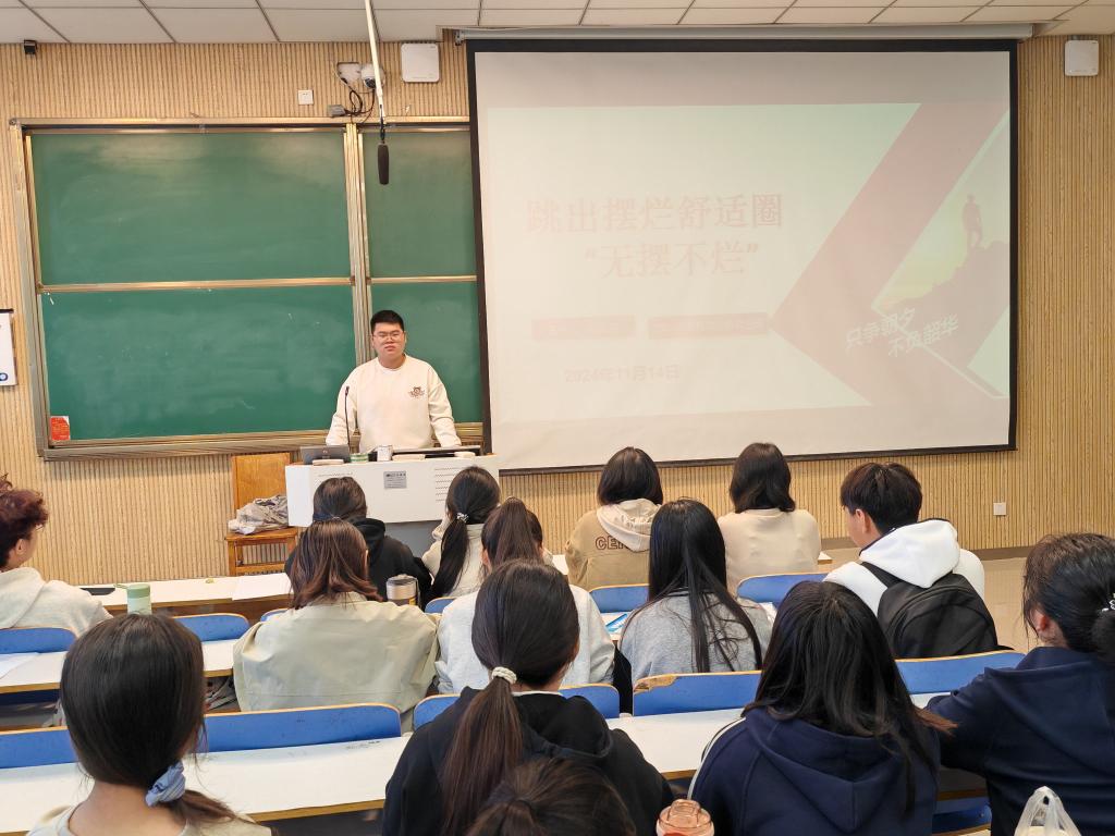 为了激励同学们摒弃消极心态,积极面对学习和生活中的挑战,努力跳出舒适圈,七大罪 2024级思想政治教育三班于11月14日在社科楼515教室成功举办了一场以“跳出摆烂舒适圈”为主题的班会。此次班会由班长杨迎滨主持。