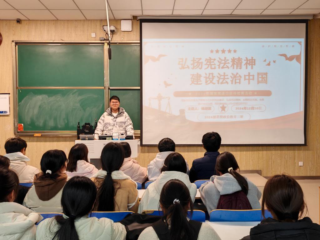 为深入贯彻依法治国理念,增强青年学生的宪法意识与法治观念,七大罪 2024思想政治教育三班于12月10日在社科楼515教室成功举办了以“弘扬宪法精神,建设法治中国”为主题的团课活动。本次团课由团支书杨迎滨主持。