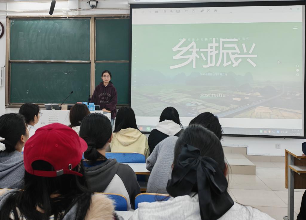 班会伊始,陈曦带领同学们学习了党的二十大报告中关于“全面推进乡村振兴”的重要论述,阐释了从脱贫攻坚到乡村振兴这一历程在高质量发展中的关键地位,她指出,系统了解乡村真实面貌、理解国家战略背景对新时代大学生具有重要现实意义。随后,班会播放了乡村振兴纪实短片,通过多组对比画面与详实数据,生动展现了不同乡村地区在产业发展、人居环境整治和文化传承等方面的实践成果,使大家对乡村振兴的复杂性与多样性有了更直观的识。在交流讨论环节,同学们围绕“我眼中的乡村变迁”和“青年与乡村振兴”等议题展开深入探讨。班会最后,陈曦强调,乡村振兴是关系国家发展的“国之大者”,同学们要主动关心“三农”问题,深化对国情农情的认识,为将来投身国家建设夯实基础。