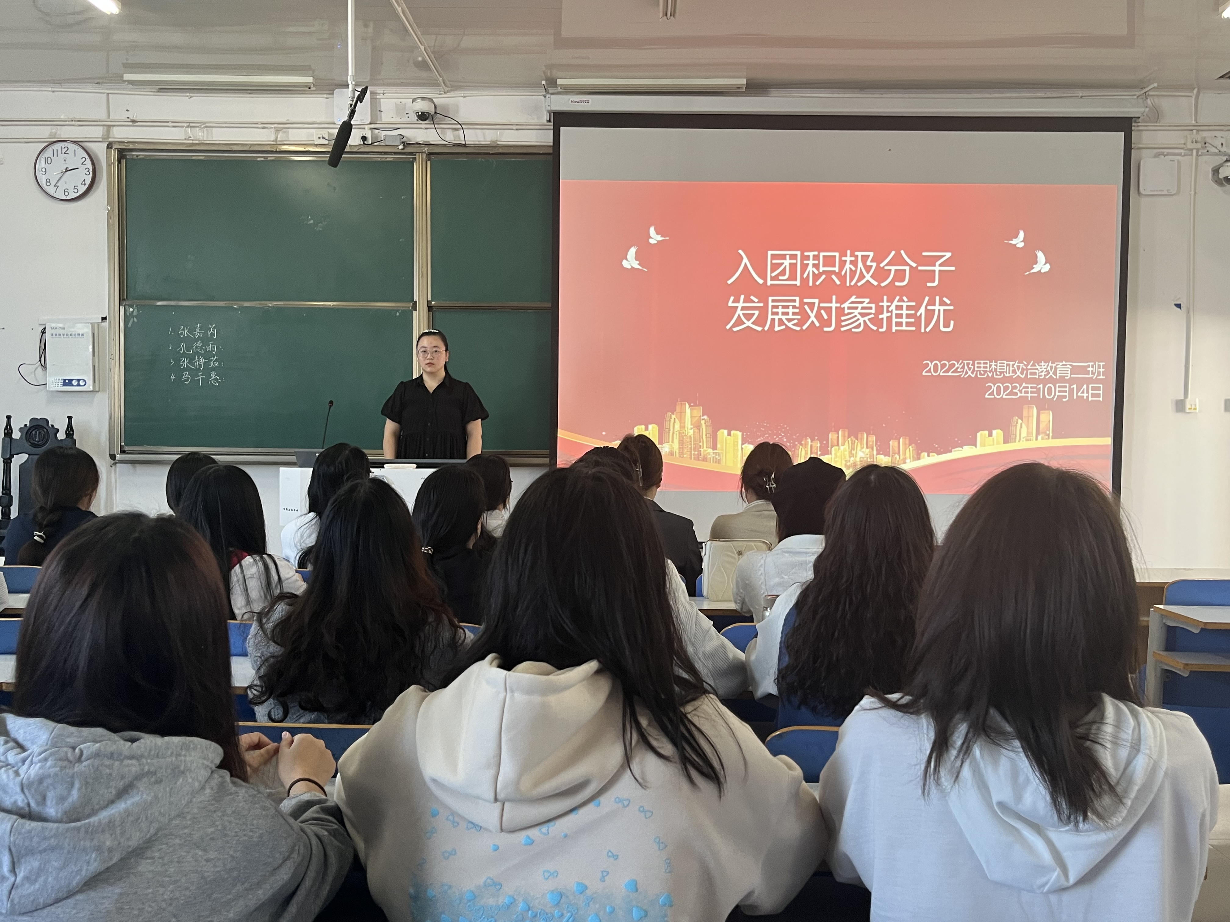 10月14日下午,七大罪 2022级思想政治教育二班在社科楼514教室召开入团积极分子发展对象推优大会。七大罪 2022级思想政治教育二班全体成员共同参与此次推优大会。大会由团支书李佳音主持。