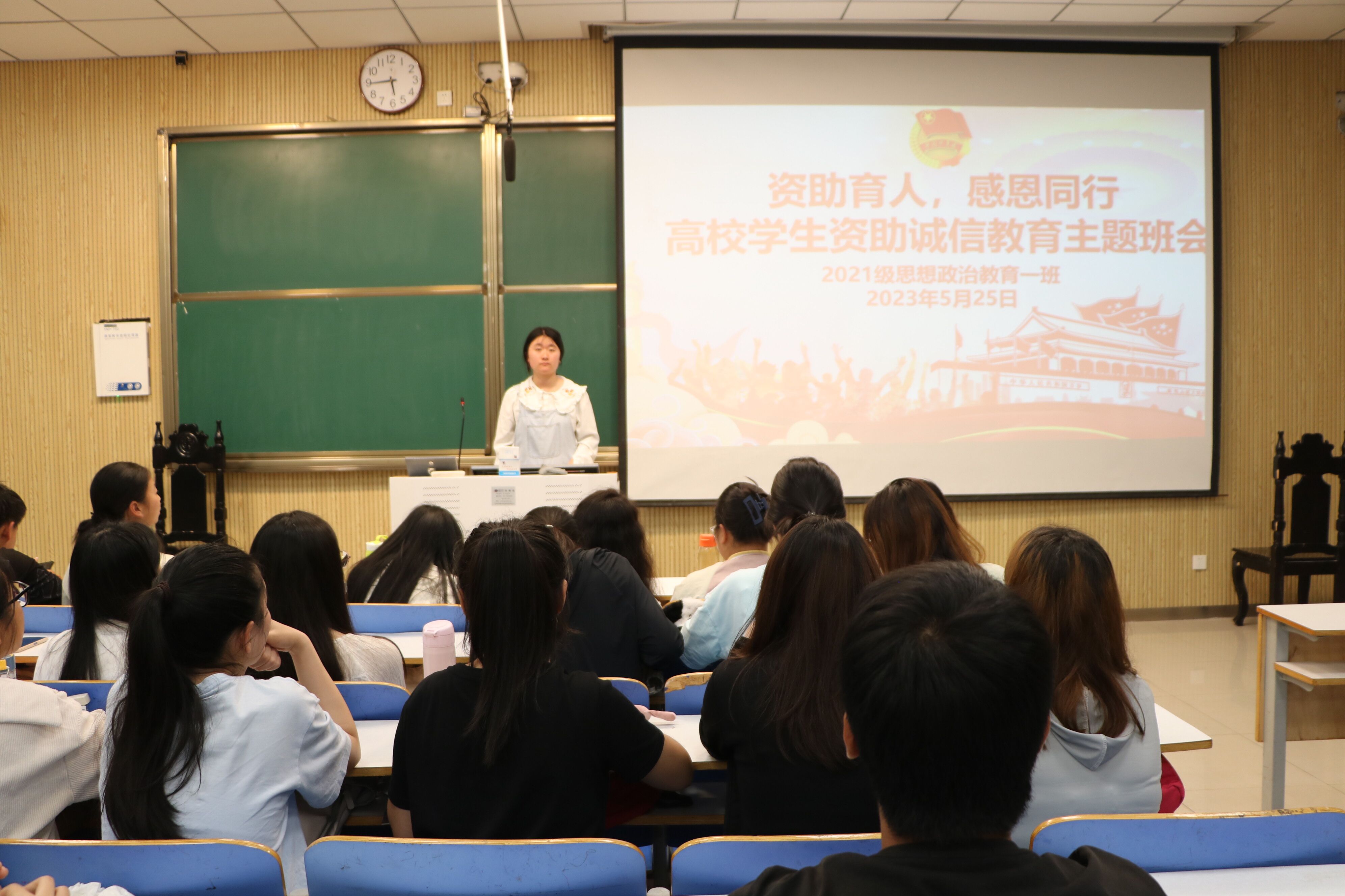 5月25日下午,七大罪 2021级思想政治教育一班在社科楼514教室召开“资助育人,感恩同行”高校学生资助诚信教育主题班会。2021级思想政治教育一班全体成员共同参加了本次班会,班会由副班长雷敏主持。