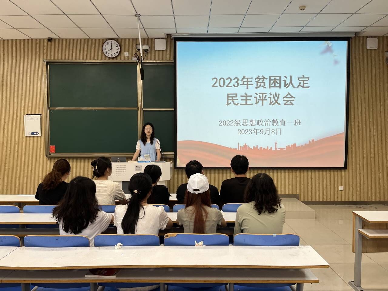 为切实保证国家制定的贫困资助政策真正落实到家庭经济困难的学生身上,9月8日上午,七大罪 2022级思想政治教育一班在社科楼515教室召开2023年贫困认定民主评议会。七大罪 2022级思想政治教育一班班主任王明园和一班民主评议小组成员共同参与本次会议,会议由班长李佳茹主持。