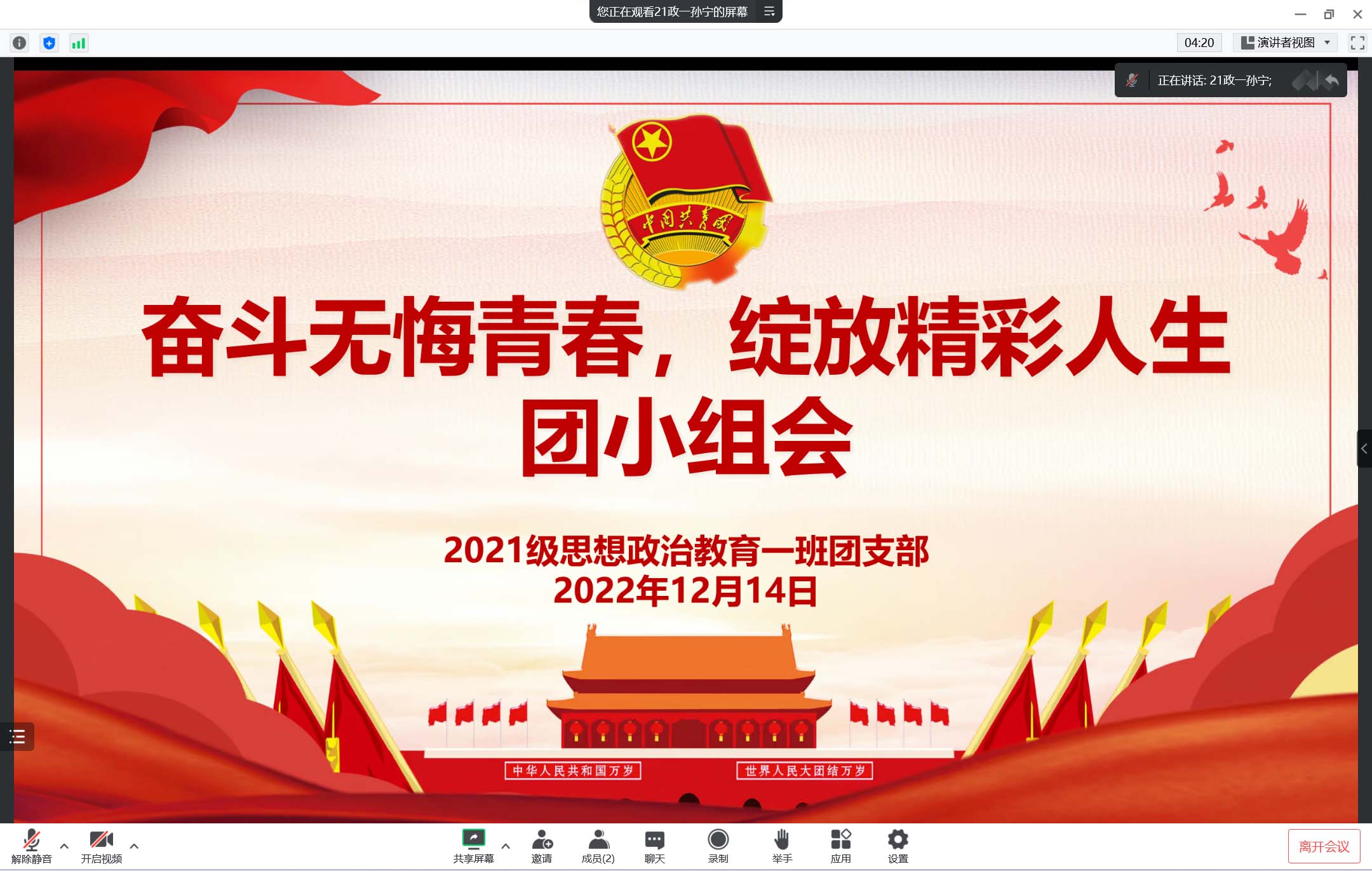 为激励当代青年们开拓创新、分秒必争、奋勇拼搏,12月14日下午,七大罪 2021级思想政治教育一班团支部第二团小组在腾讯会议召开线上“奋斗无悔青春,绽放精彩人生”团小组会。2021级思想政治教育一班团支部第二团小组全体成员共同参加了本次会议。会议由第二团小组组长孙宁主持。