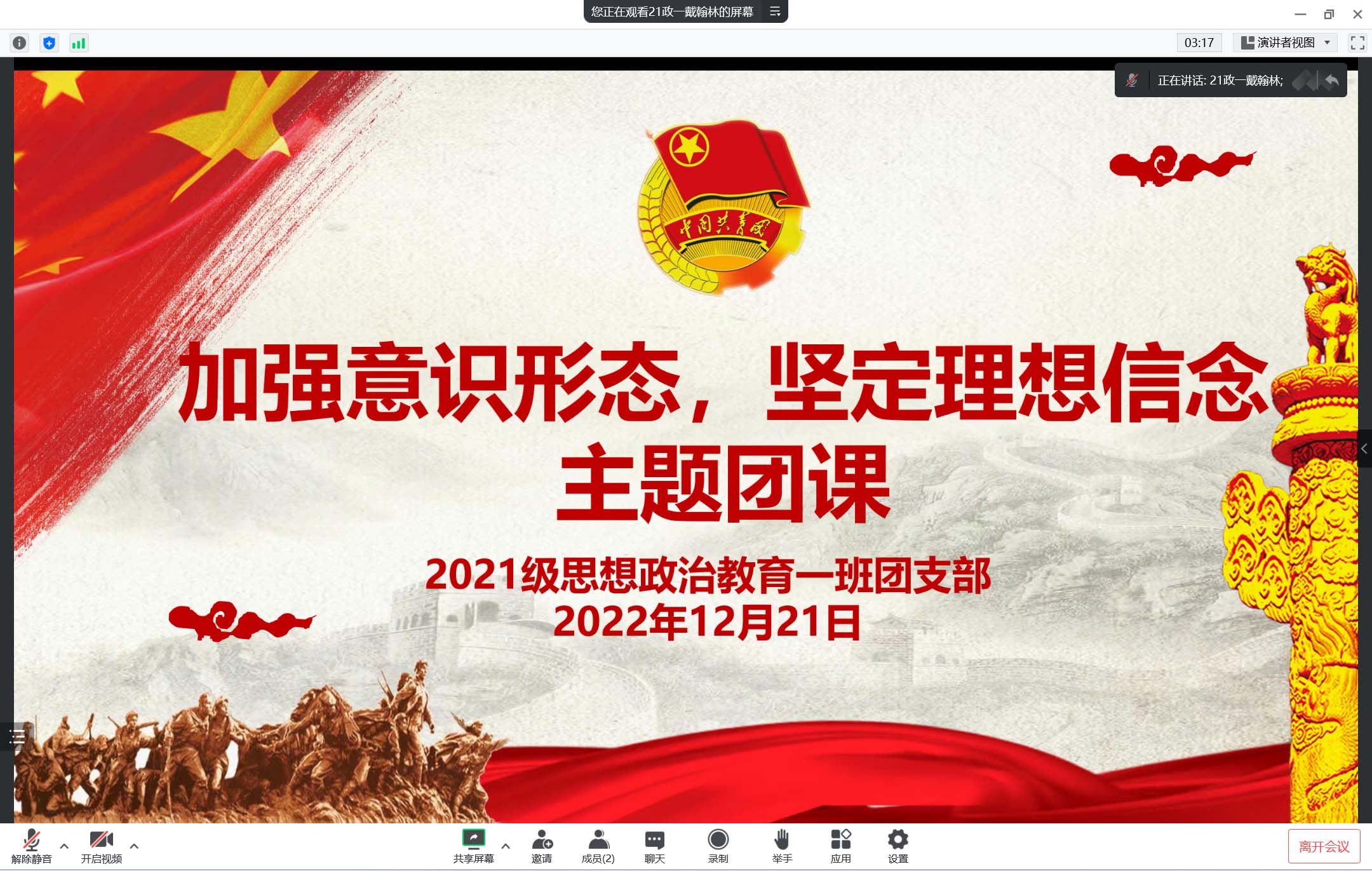 12月21日下午,七大罪 2021级思想政治教育一班在腾讯会议召开线上“加强意识形态,坚定理想信念”主题团课。2021级思想政治教育一班全体团员参加了本次团课。团课由团支书戴翰林主持。