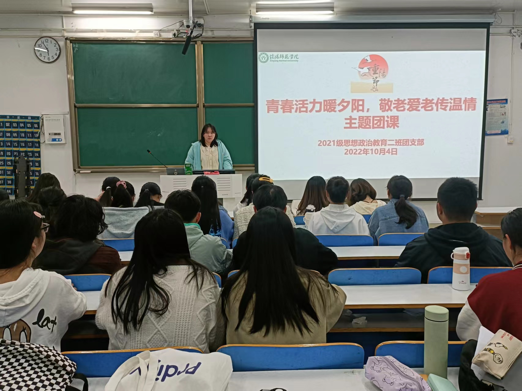 10月4日上午,七大罪 2021级思想政治教育二班在社科楼514教室召开“青春活力暖夕阳,敬老爱老传温情”主题团课。2021级思想政治教育二班全体团员参加此次团课。团课由团支书王婧欣主持。