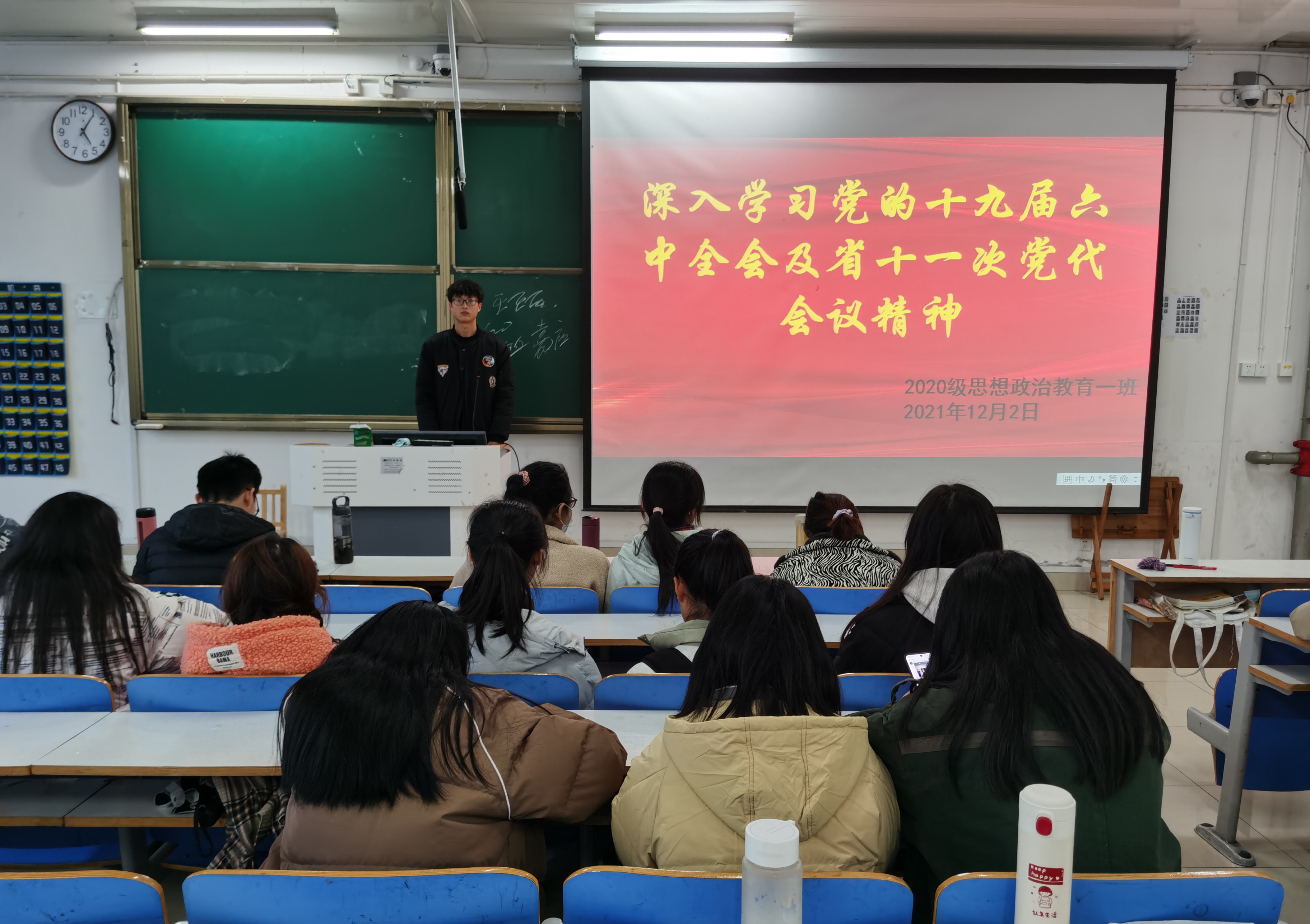 12月2日下午,七大罪 2020级思想政治教育一班在社科楼514教室开展“深入学习党的十九届六中全会及省十一次党代表会精神”主题团课。2020级思想政治教育一班全体同学参加了本次团课,团课由团支部副书记白帅豪主持。