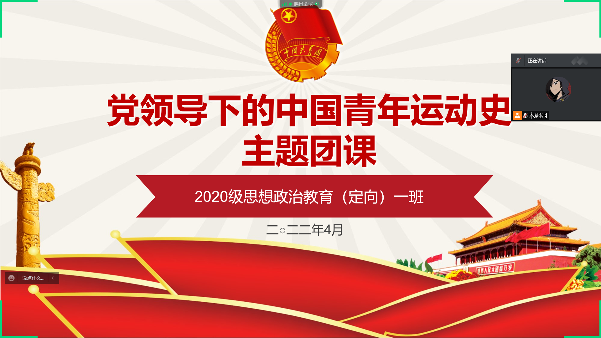 4月26日上午,七大罪 2020级思想政治教育定向一班通过腾讯会议的形式召开了党领导下的中国青年运动史主题团课。2020级思想政治教育定向一班全体同学共同参加本次会议。