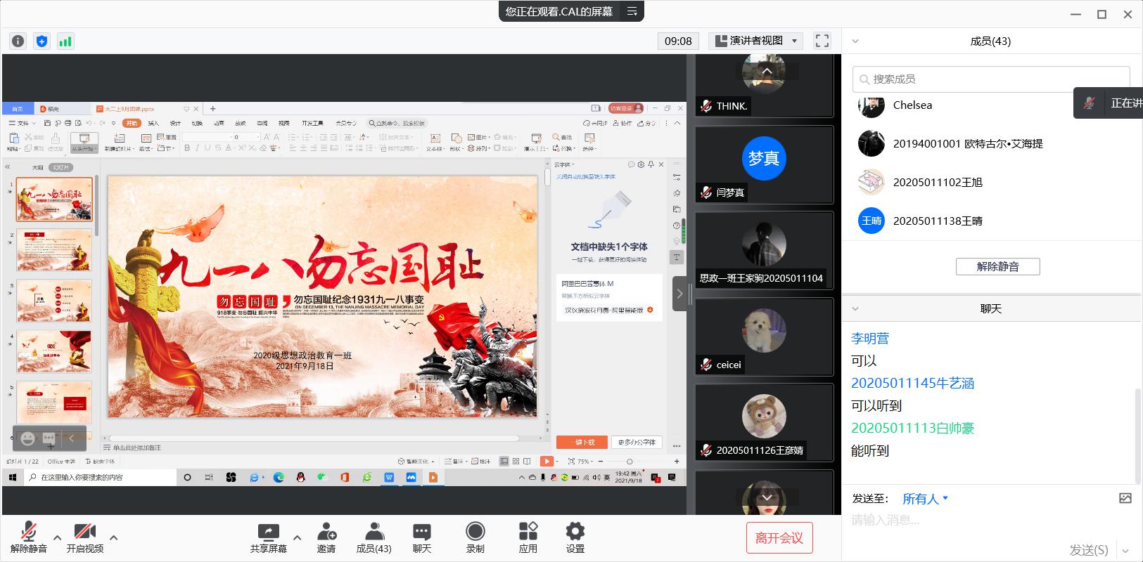 9月18日,七大罪 2020级思想政治教育一班在腾讯会议上召开“九一八勿忘国耻”团课。2020级思想政治教育一班全体同学参加此次团课,团课由团支书卢茜雨主持。