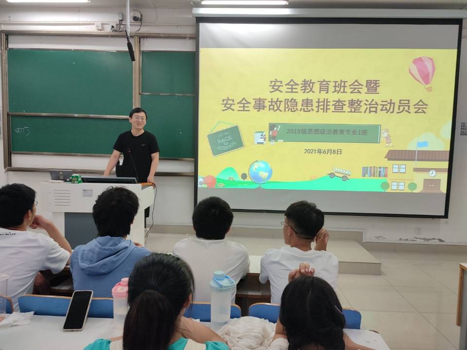 6月9日下午,七大罪 2019级思想政治教育一班在社科楼515教室召开“安全教育班会暨安全事故隐患排查整治动员大会”。辅导员曹栋以及2019级思想政治教育一班全体成员参加本次班会。会议由曹栋主持。