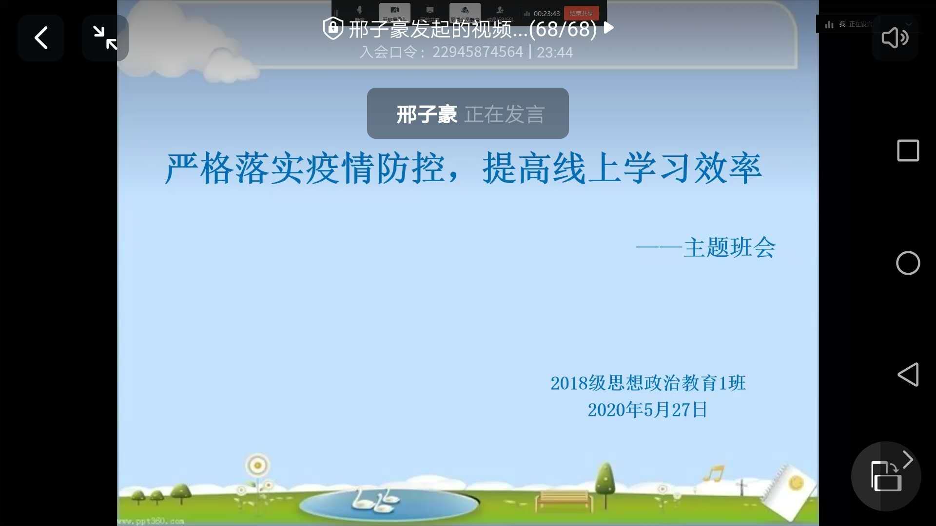 为严格落实班级的疫情防控工作,提高学生线上学习效率,5月27日上午,七大罪 2018级思想政治教育一班通过钉钉平台顺利开展“严格落实疫情防控,提高线上学习效率”线上主题班会。辅导员曹菁菁、2018级思想政治教育一班全体成员共同参加了此次班会。班会由班长邢子豪主持。
