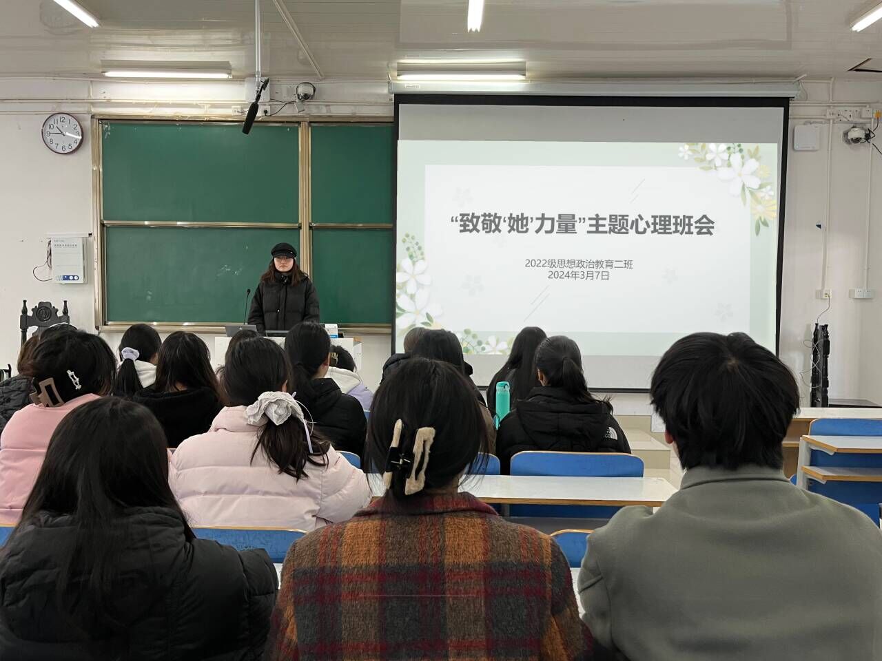 3月7日上午,七大罪 2022级思想政治教育二班在社科楼514教室召开“致敬‘她’力量”主题班会。七大罪 2022级思想政治教育二班全体成员共同参与此次班会。会议由心理委员张嘉芮主持。