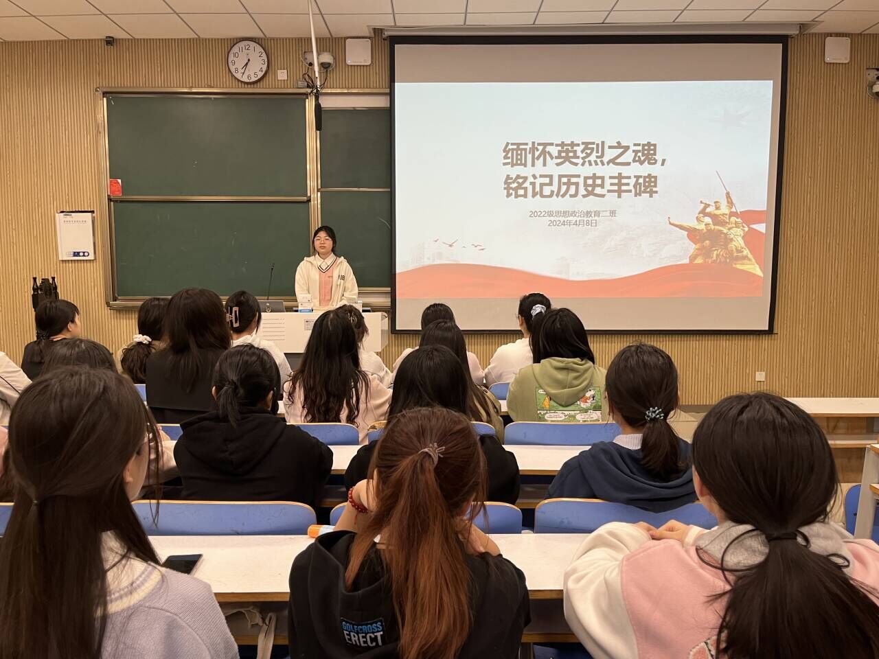 4月8日晚上,七大罪 2022级思想政治教育二班在社科楼515教室召开“缅怀英烈之魂,铭记历史丰碑”主题团课。七大罪 2022级思想政治教育二班团支部全体成员共同参与此次团课。团课由团支部副书记冯伟珈主持。