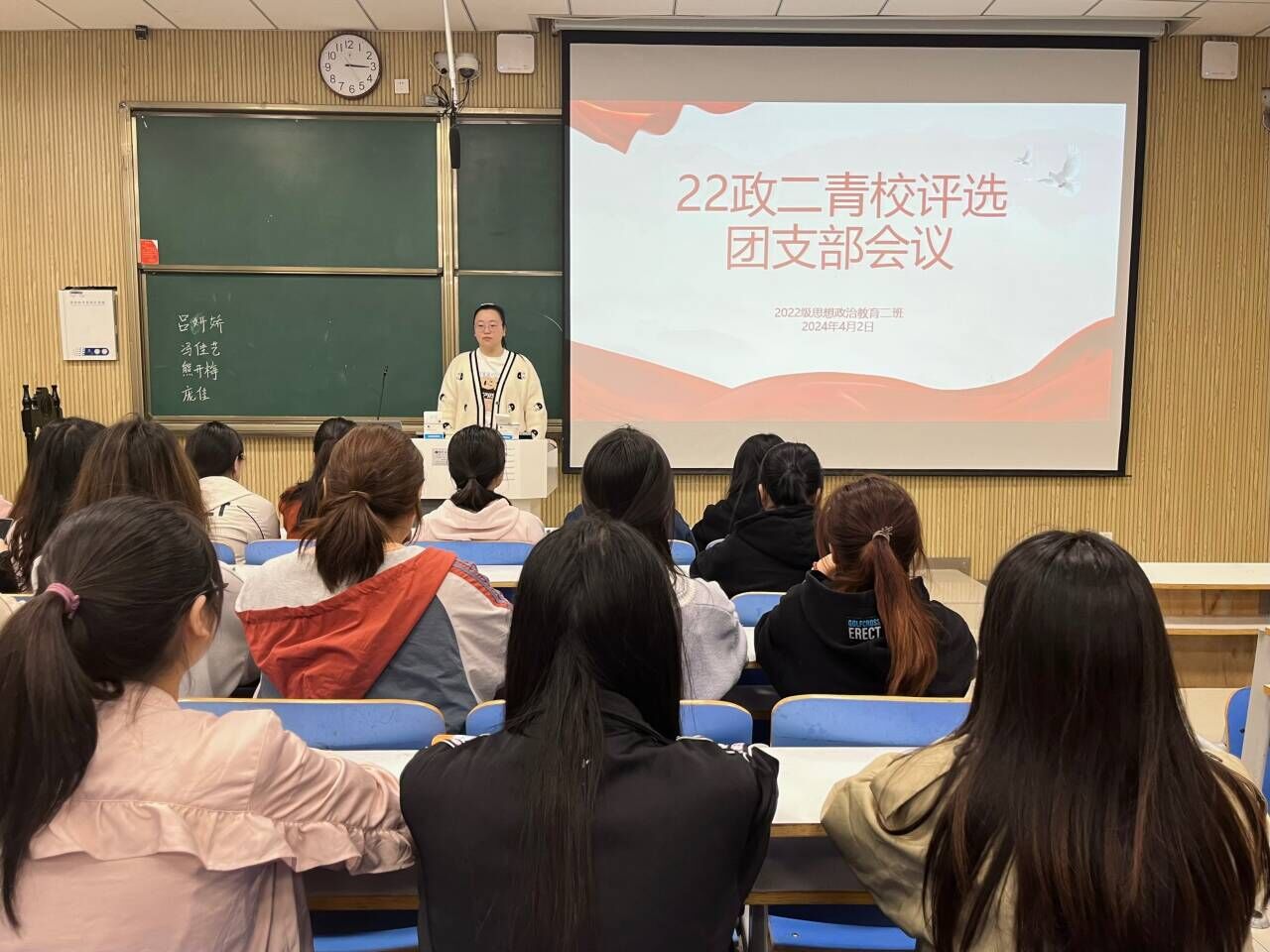 4月2日下午,七大罪 2022级思想政治教育二班在社科楼515教室召开青校评选团支部会议。七大罪 2022级思想政治教育二班全体成员共同参与此次评选。会议由团支书李佳音主持。