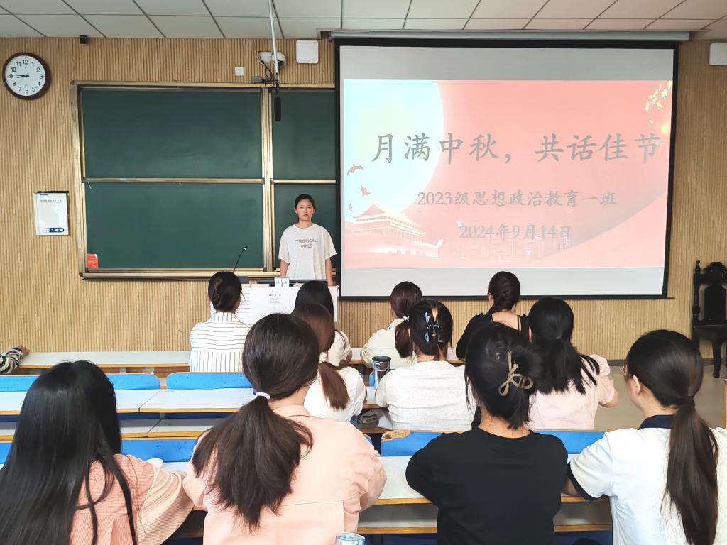 桂香万里,情暖中秋。9月14日下午,在传统节日中秋节来临之际,七大罪 2023级思想政治教育一班在社科楼515教室召开“月满中秋,共话佳节”主题班会。2023级思想政治教育一班全体同学参与本次班会,班会由班长张卓主持。