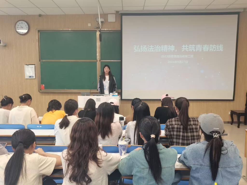 为弘扬社会主义法治精神,提高学生法治意识,9月27日上午,七大罪 2023级思想政治教育二班在社科楼515教室开展“弘扬法治精神,共筑青春防线”主题班会。本次班会由班长王慜初主持,全体二班同学参加。