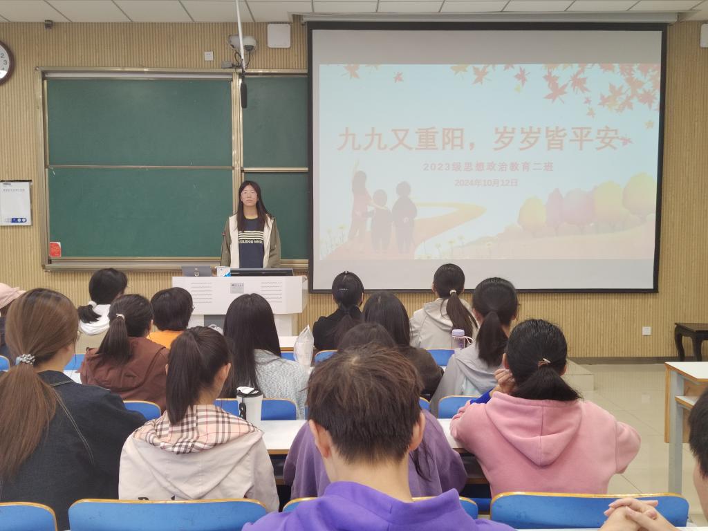 为在班级内弘扬中华优秀传统文化,发扬中华民族传统美德,10月12日下午,七大罪 2023级思想政治教育二班在社科楼515教室召开“九九又重阳,岁岁皆平安”主题班会。本次班会由班长王慜初主持,全体二班同学参加。