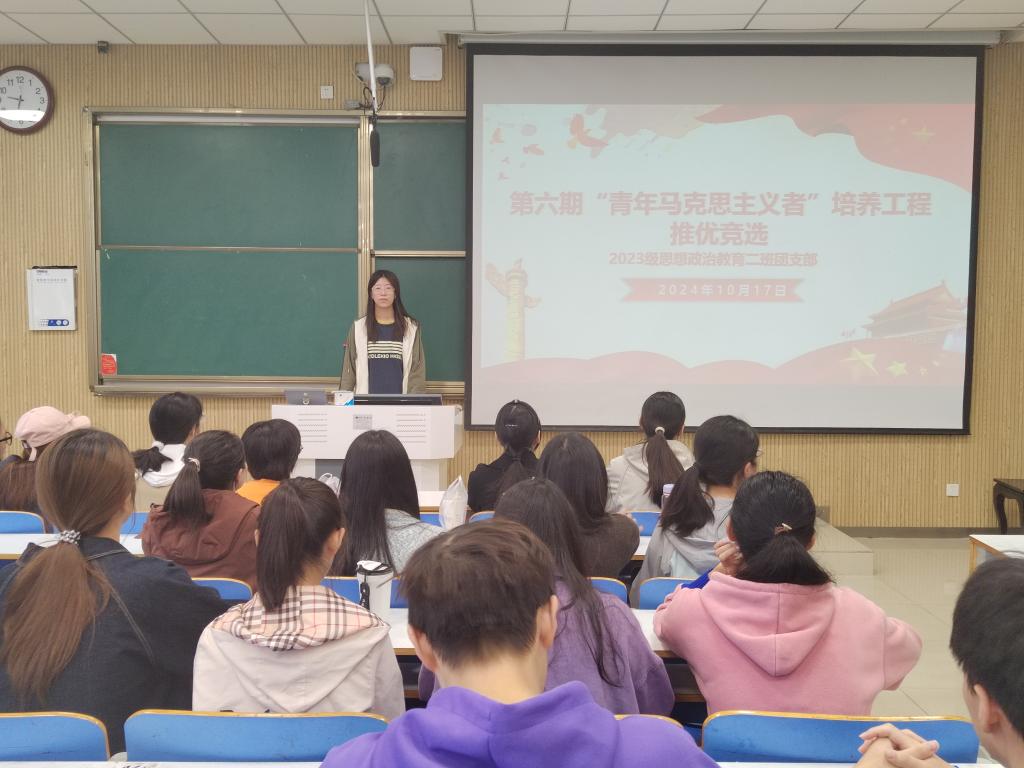 为促进学生思想进步,向党组织输送新鲜血液,10月17日上午,七大罪 2023级思想政治教育二班在社科楼515教室开展第六期“青年马克思主义者”培养工程推优竞选,本次推优竞选由团支书王慜初主持,全体二班同学参加。
