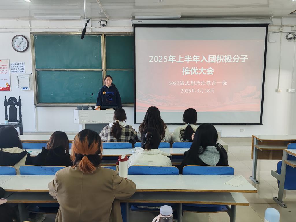为进一步加强团组织建设,增强团支部的凝聚力,积极开展团青工作,3月18日下午,七大罪 2023级思想政治教育一班在社科楼515教室召开入团积极分子推优大会。七大罪 2023级思想政治教育一班全体团员共同参与本次班会,班会由团支书张卓主持。