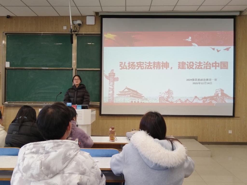 为增强我班学生的宪法意识和法治素养,筑牢法治信仰根基,12月14日上午,七大罪 2024级思政一班于社科楼514教室开展“弘扬宪法精神,建设法治中国”主题团课。本次团课由一班团支书李冉主持,一班全体同学参加。