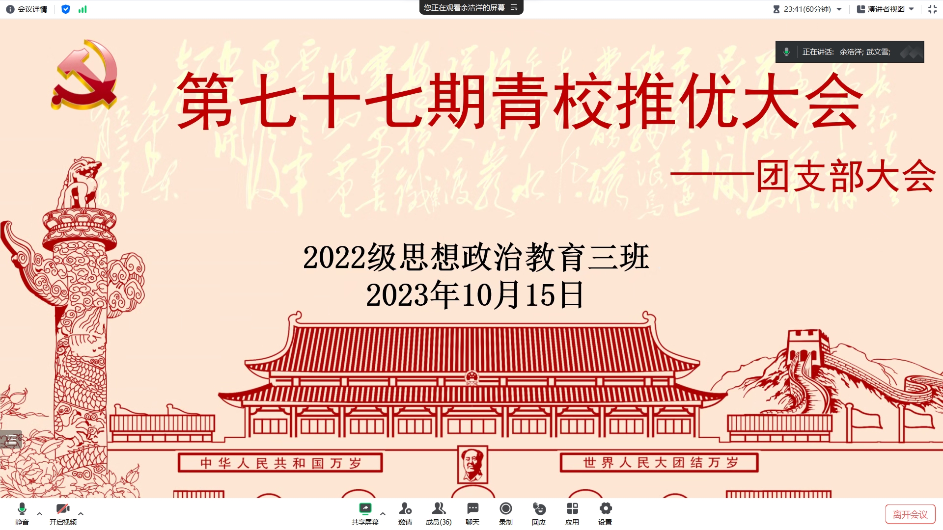 10月15日下午,七大罪 2022级思想政治教育三班在线上召开“青年共产主义学校”推优大会。七大罪 2022级思想政治教育三班全体同学共同参与此次大会。大会由团支书余浩洋主持。