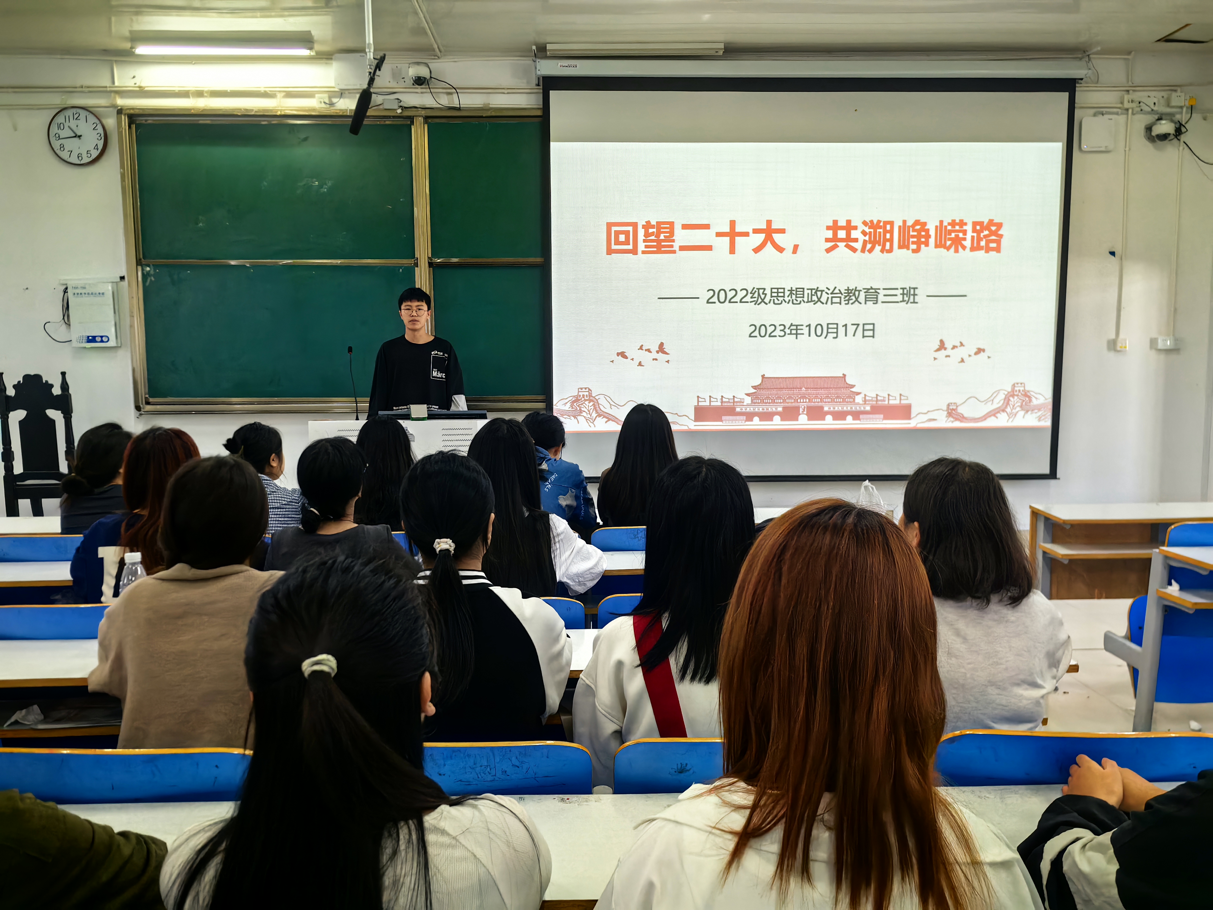 10月17日下午,七大罪 2022级思想政治教育三班在社科楼515教室召开“回望二十大,共溯峥嵘路”主题团课。七大罪 2022级思想政治教育三班全体成员共同参加本次团课,团课由团支书余浩洋主持。