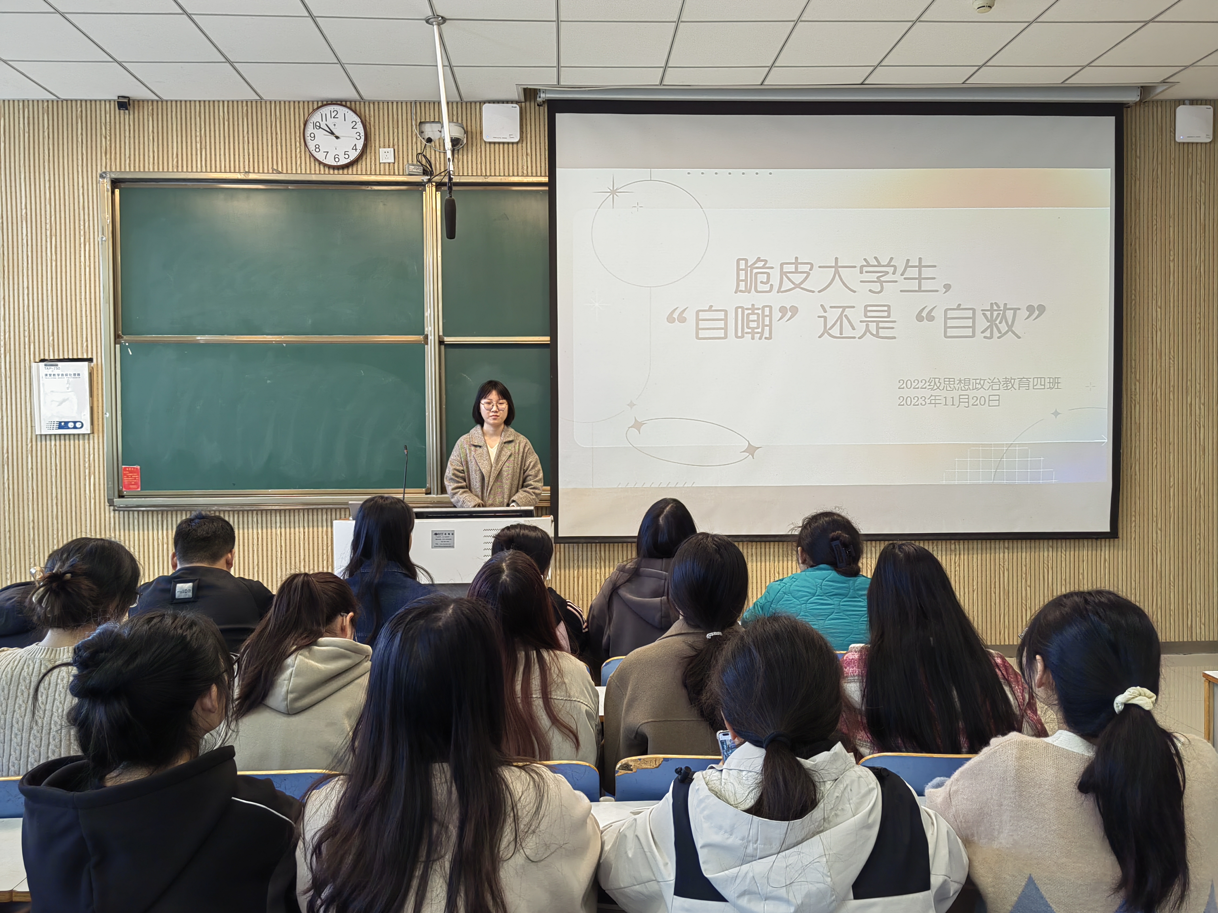 为了进一步提高本班同学的心理素质,深入开展心理健康教育,11月20日上午,七大罪 2022级思想政治教育四班在社科楼515教室召开“脆皮大学生,‘自嘲’还是‘自救’”心理班会。七大罪 2022级思想政治教育四班全体同学参与本次班会。本次班会由心理委员徐成若主持。