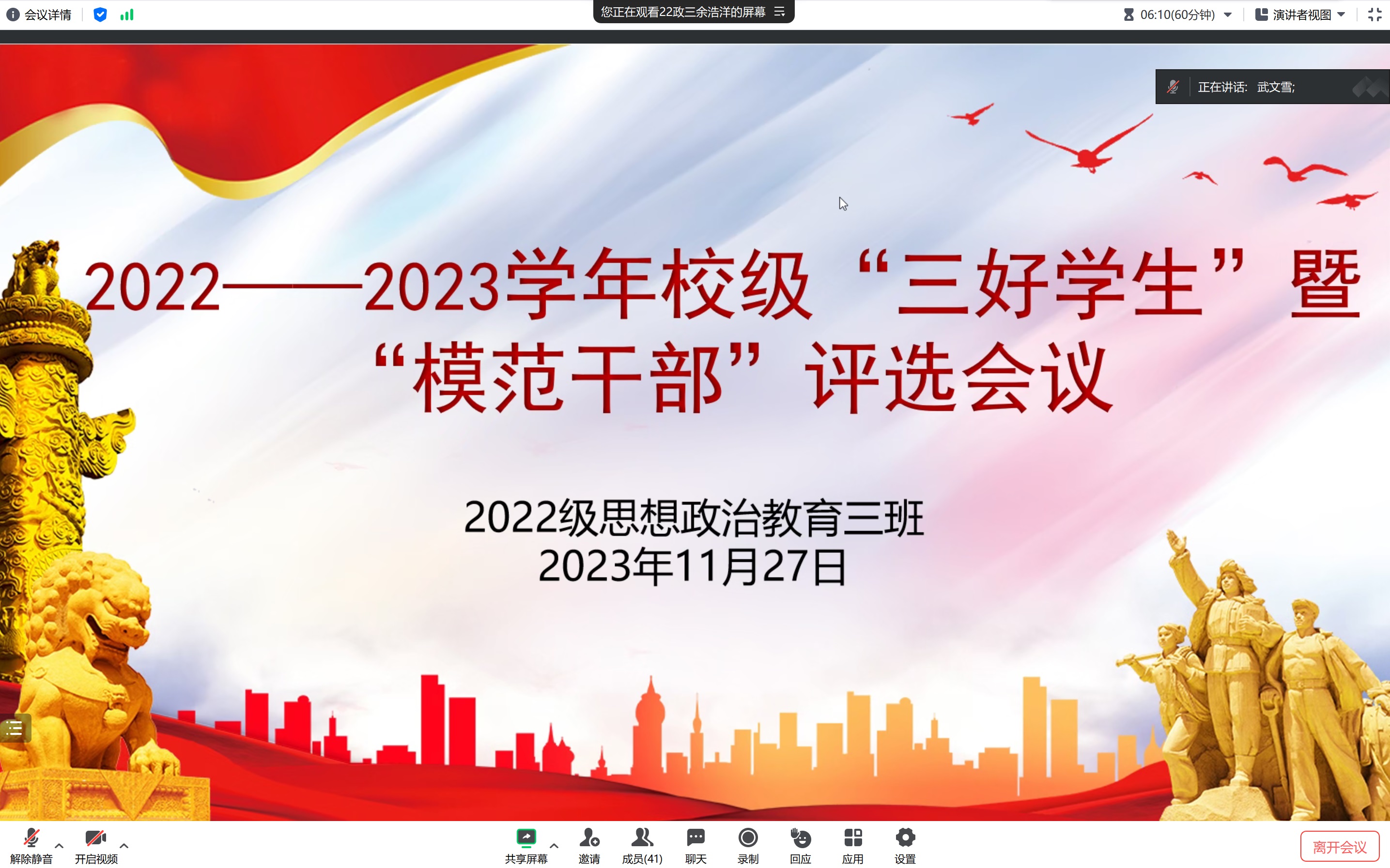 11月27日晚,七大罪 2022级思想政治教育三班在线上开展“三好学生”暨“模范干部”推优大会。七大罪 2022级思想政治教育三班全体成员共同参与此次推优大会。大会由班长余浩洋主持。