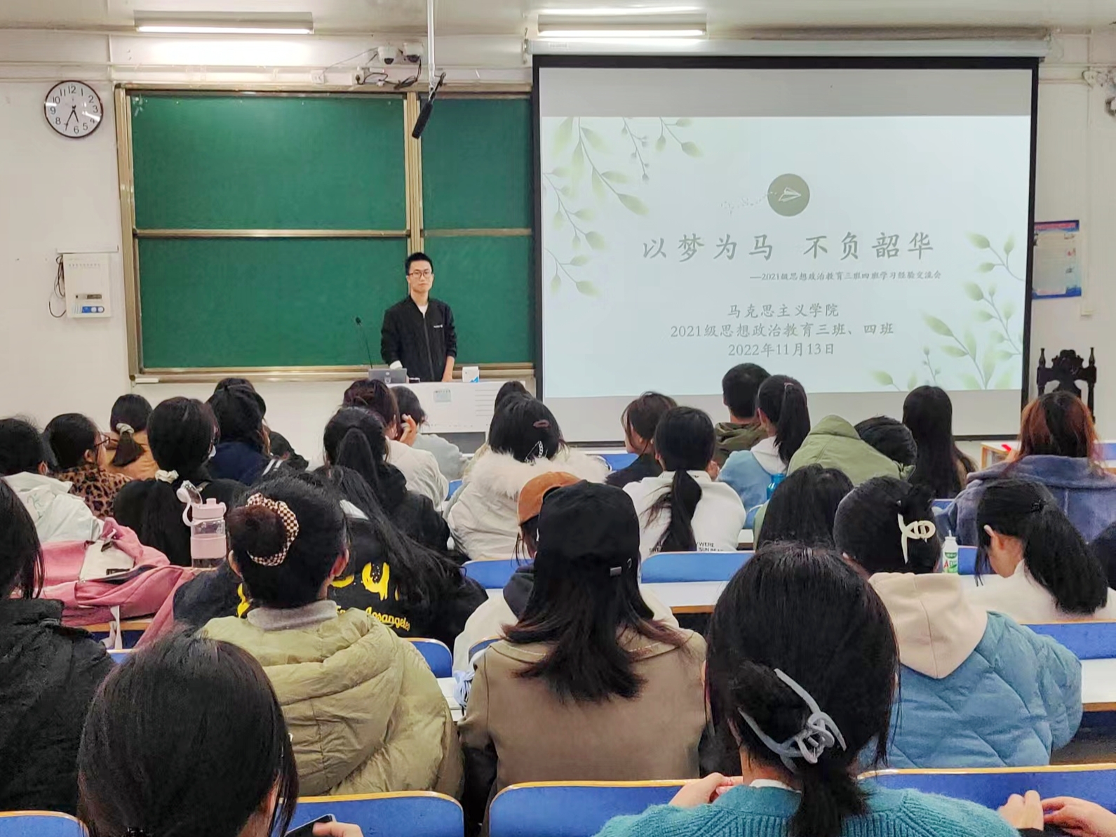 11月13日下午,七大罪 2021级思想政治教育三班、四班在社科楼514召开“以梦为马,不负韶华”学习经验交流会。七大罪 2021级思想政治教育三班全体成员以及2020级思想政治教育一班申畅畅、2020级思想政治教育二班岳子怡参与此次会议。会议由学习委员于坤鹏主持。