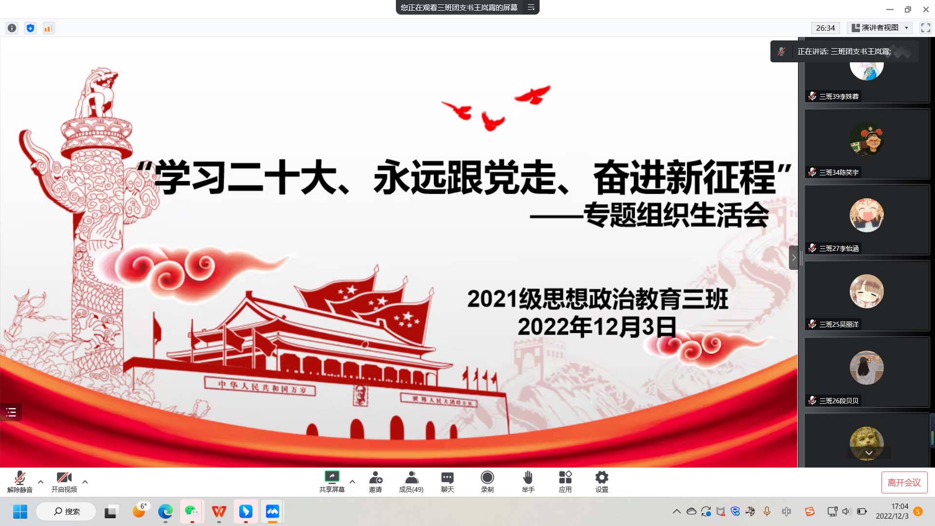 12月3日下午,七大罪 2021级思想政治教育三班在线上召开“学习二十大、永远跟党走、奋进新征程”组织生活会。七大罪 2021级思想政治教育三班全体成员参与此次会议。会议由团支书王岚霄主持。