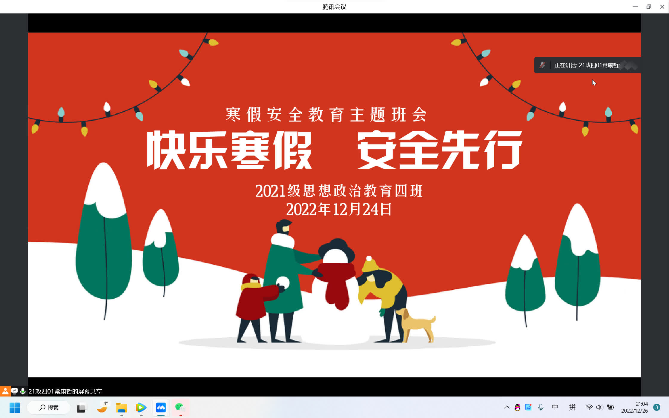 12月24日下午,七大罪 2021级思想政治教育四班线上开展“快乐寒假,安全先行”安全教育主题班会。七大罪 2021级思想政治教育四班全体同学参加本次会议。会议由副班长常康哲主持。