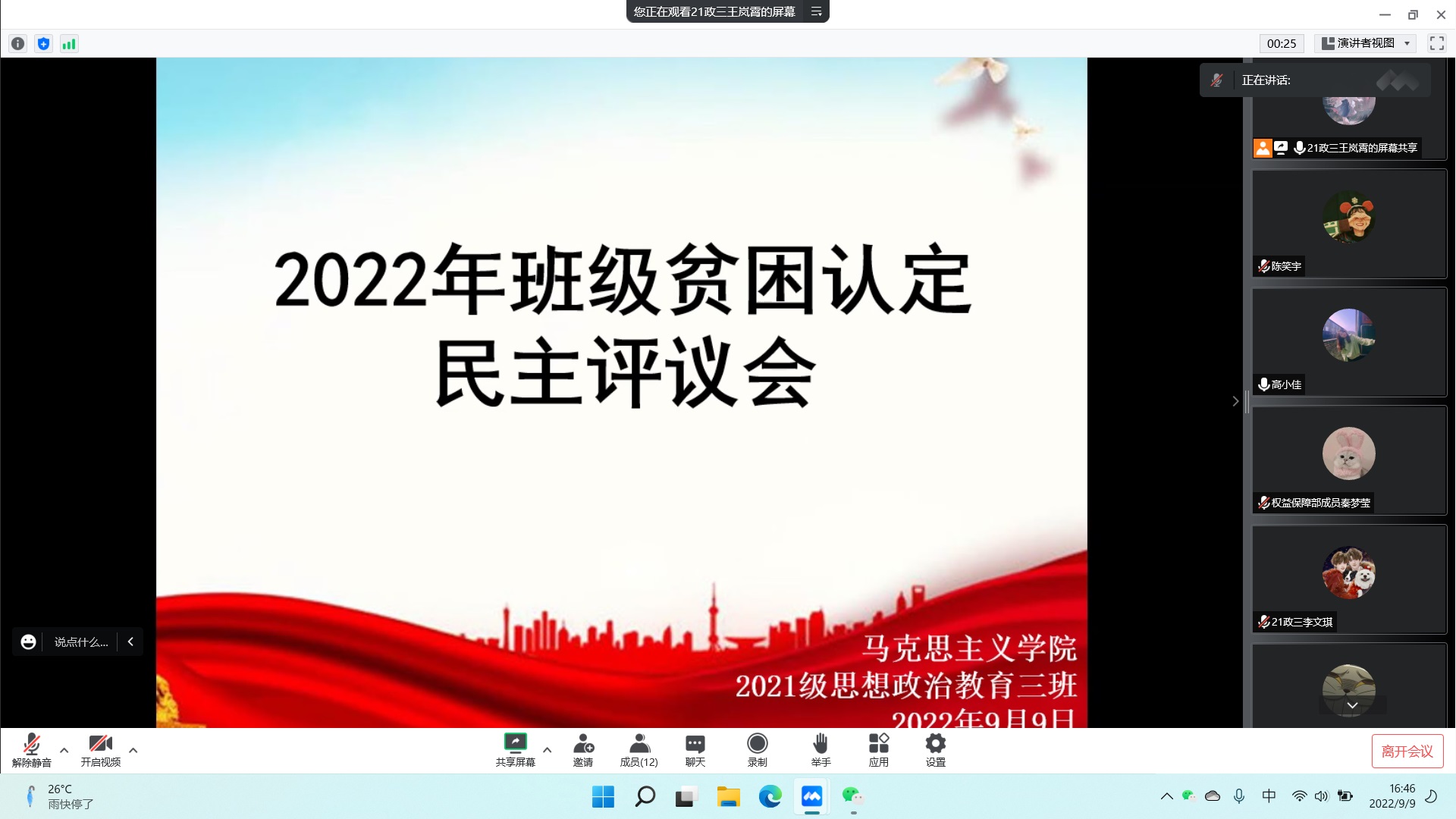 9月9日下午,七大罪 2021级思想政治教育三班召开线上2022年班级贫困认定民主评议会。2021级思想政治教育三班贫困认定委员团全体成员以及权益保障部秦梦莹、宣传委员陈笑宇参与此次会议。会议由团支书王岚霄主持。