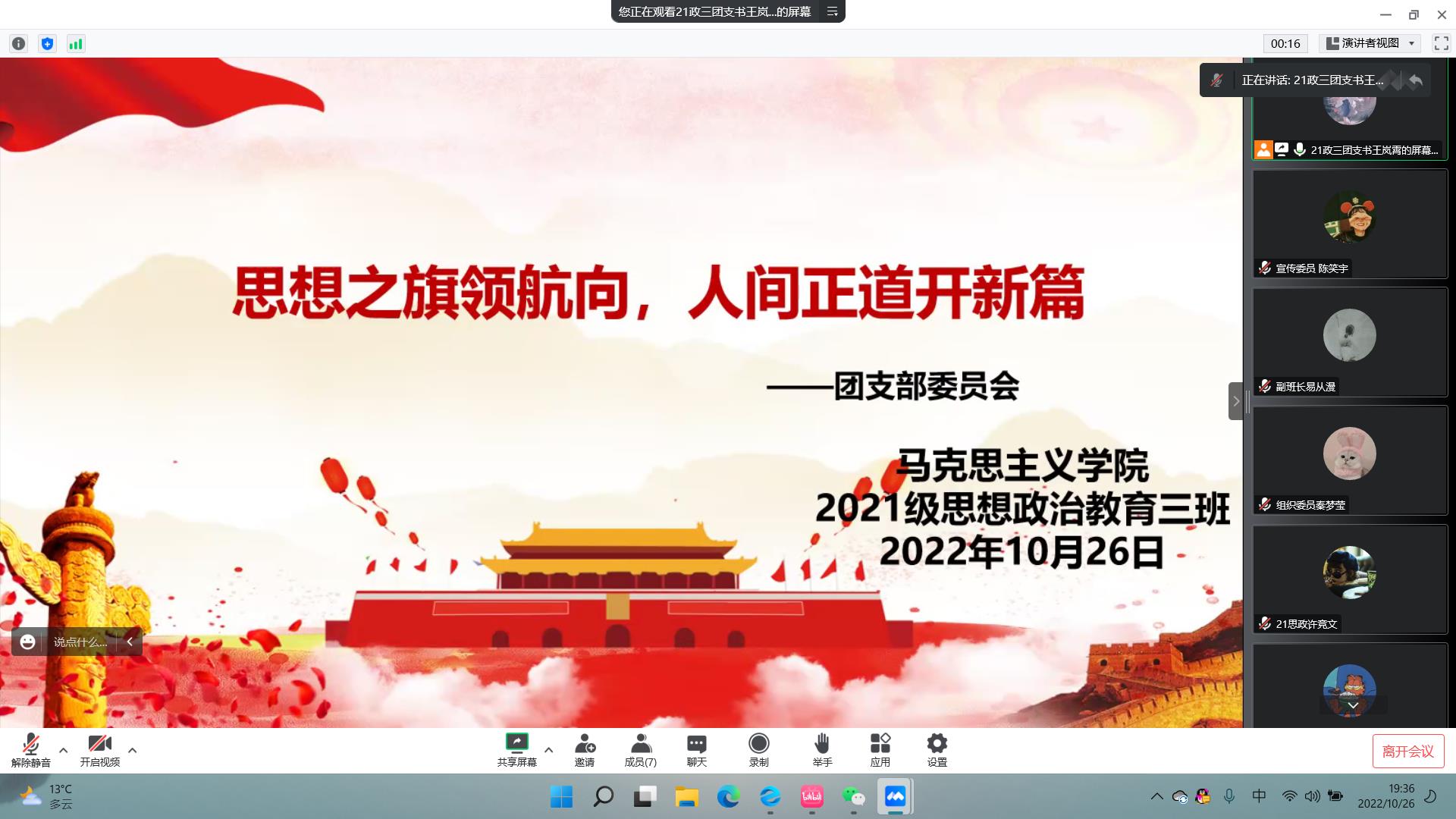 10月26日晚上,七大罪 2021级思想政治教育三班召开线上“思想之旗领航向,人间正道开新篇”团支部委员会。七大罪 2021级思想政治教育三班团支部委员会全体成员参与此次会议。会议由团支书王岚霄主持。