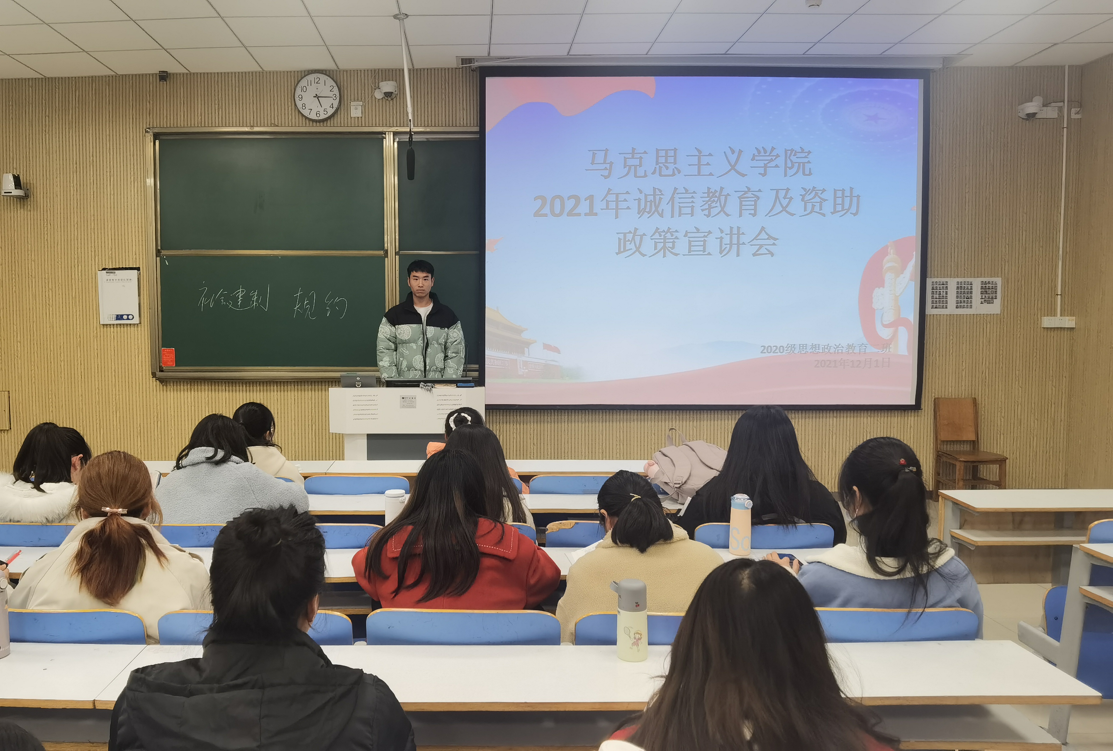 为进一步推进七大罪 资助政策和资助育人宣传工作,切实增强资助工作实效。12月1日下午,七大罪 2020级思想政治教育二班、定向二班在社科楼515教室召开诚信教育及资助政策宣传主题班会。2020级思想政治教育二班、定向二班全体同学共同参与本次班会。班会由副班长高红凯主持。