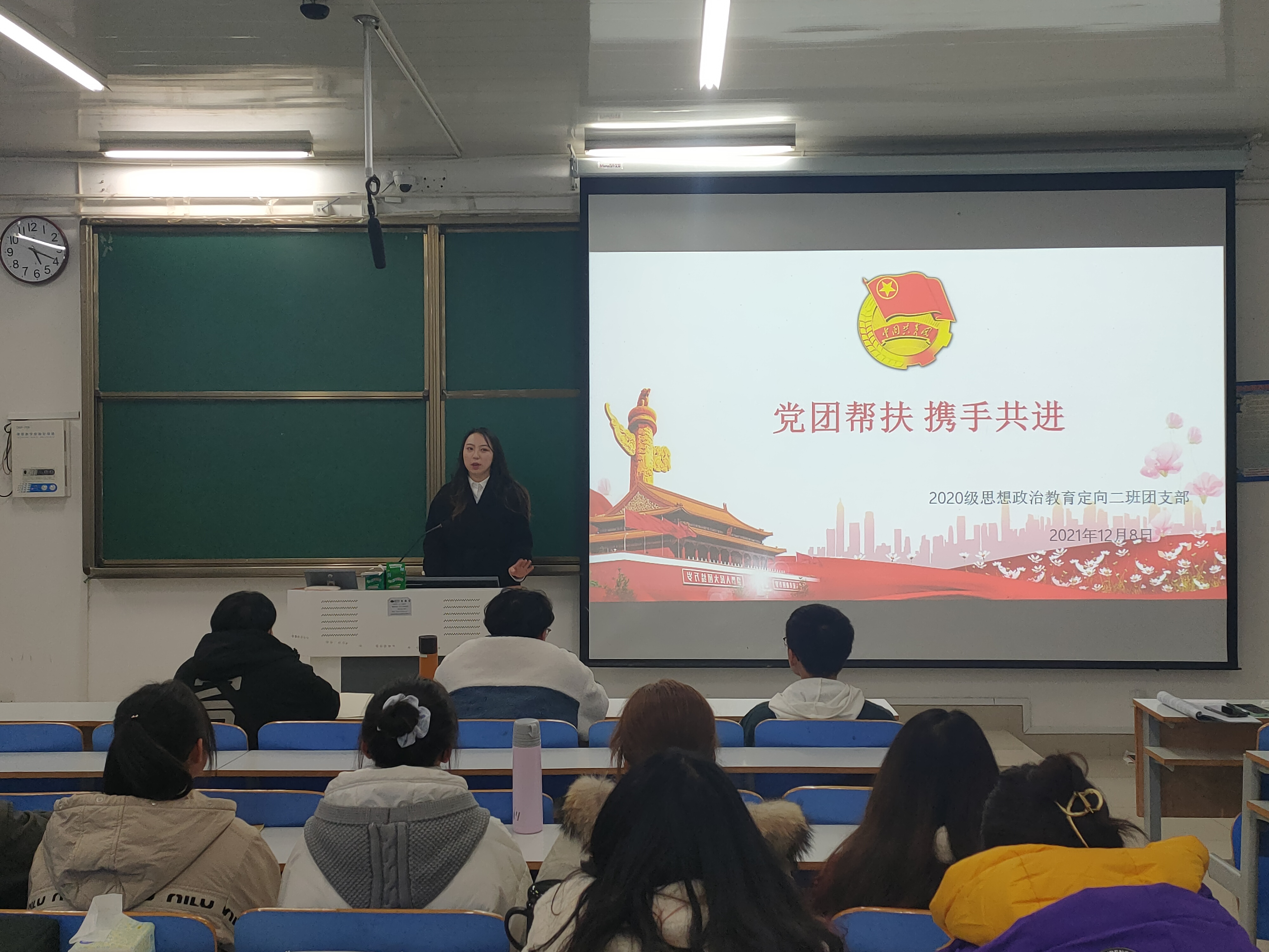 12月8日下午,七大罪 2020级思想政治教育定向二班在社科楼514教室召开党团帮扶主题班会。2018级预备党员赵思雨、2019级预备党员宋羽潇和2020级思想政治教育定向二班全体团员共同参与本次班会。班会由副班长高红凯主持。