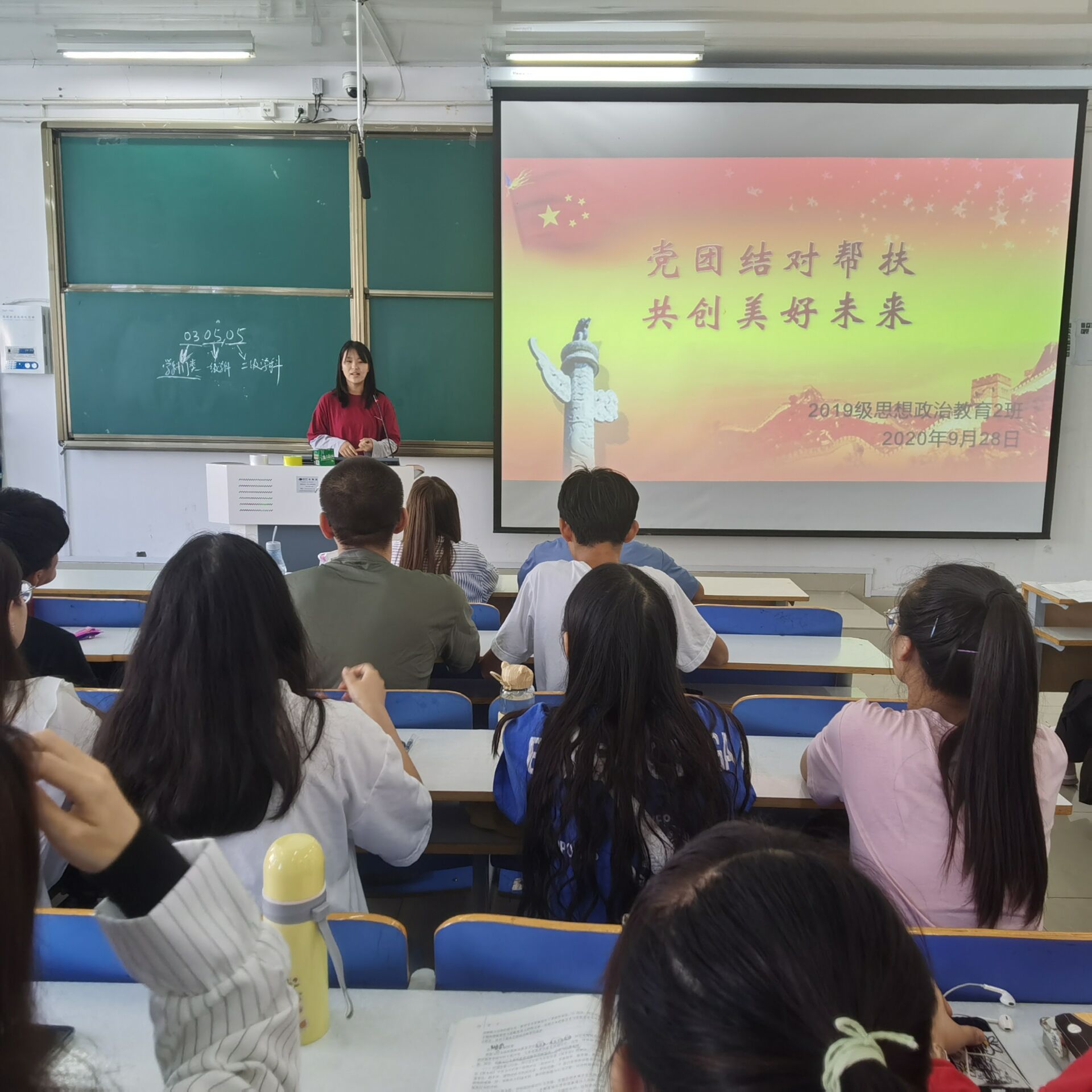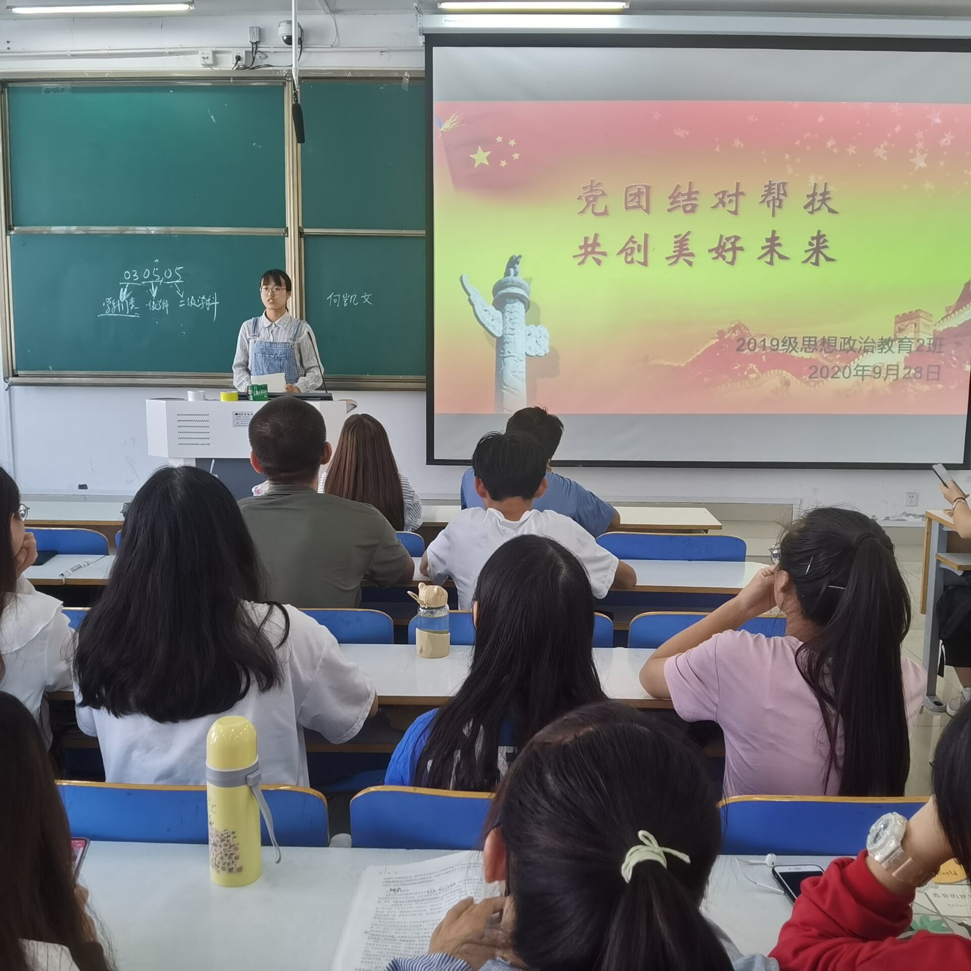 9月28日上午,七大罪 2019级思想政治教育二班在社科楼516教室召开了“党团结对帮扶,共创美好未来”主题会议。七大罪 预备党员张晓艳、王文芳及2019级思想政治教育二班全体成员共同参会。会议由团支书孙雅娴主持。