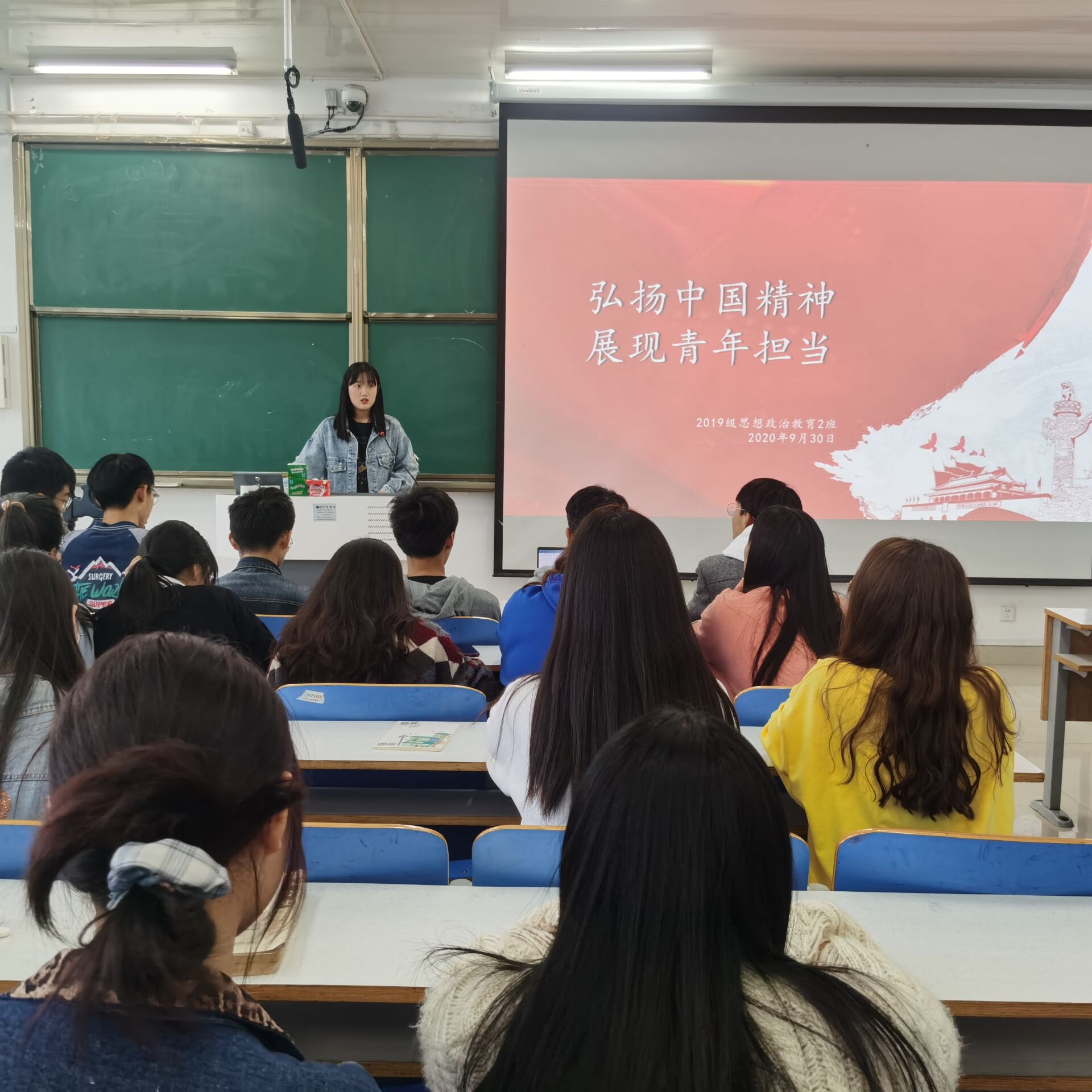 10月4日下午,七大罪 2019级思想政治教育二班在社科楼514教室召开了“弘扬中国精神,展现青年担当”主题团课。2019级思想政治教育二班全体成员共同参会。会议由团支书孙雅娴主持。