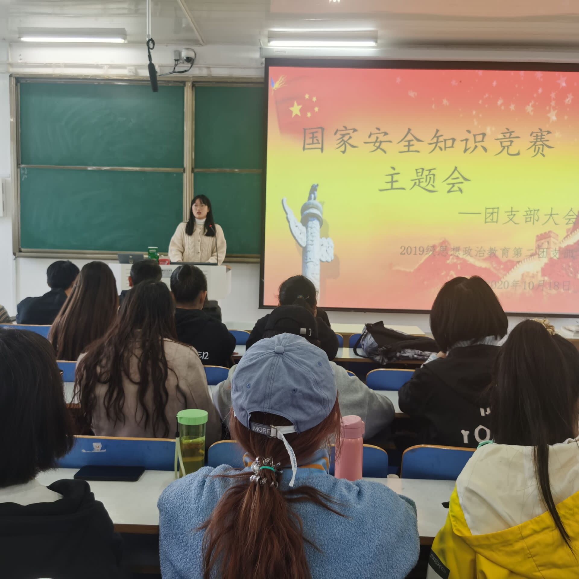 10月19日下午,七大罪 2019级思想政治教育二班在社科楼516教室召开“国家安全知识竞赛”主题团课。2019级思想政治教育二班全体成员共同参会。会议由团支书孙雅娴主持。