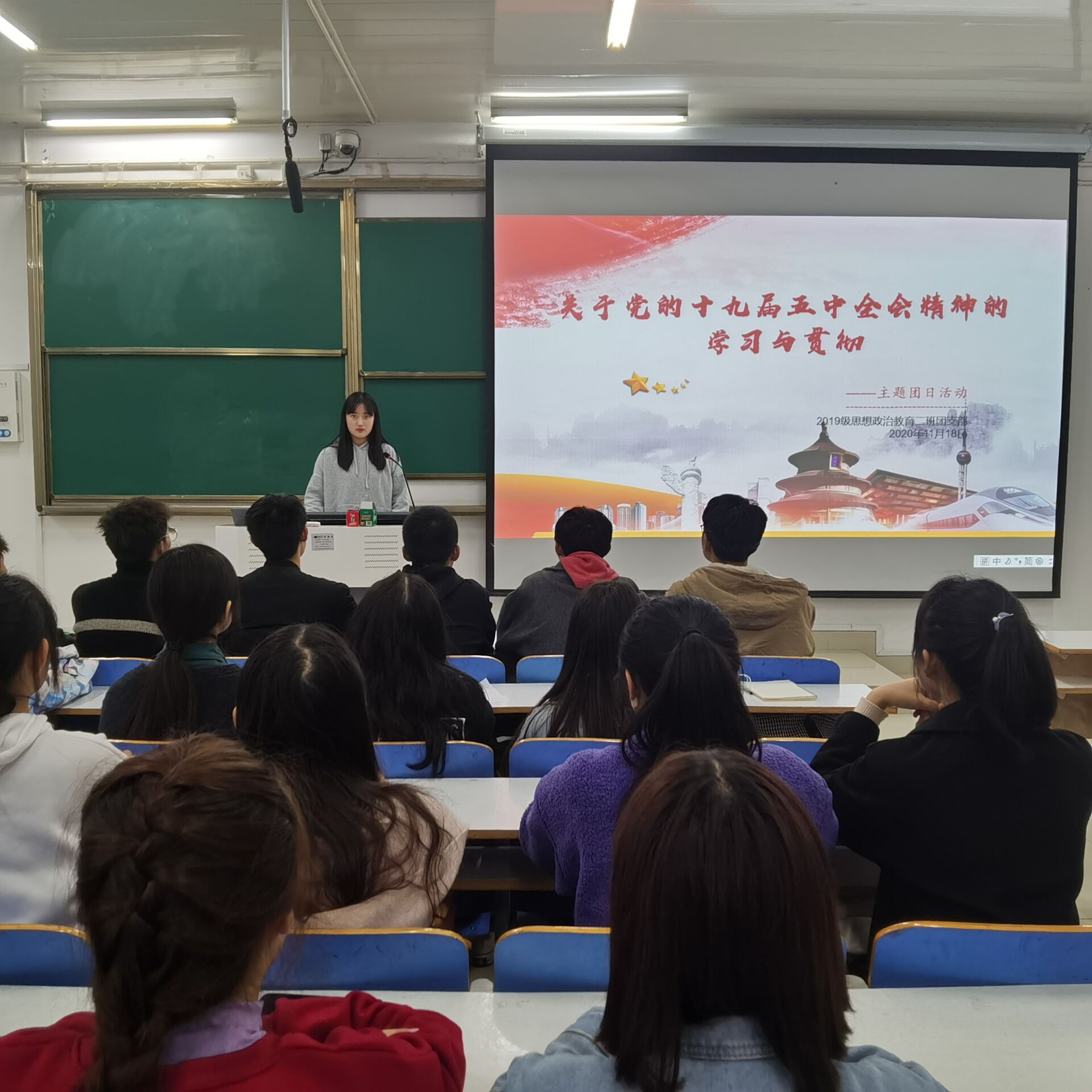 11月18日下午,七大罪 2019级思想政治教育二班在社科楼514教室召开学习与贯彻党的十九届五中全会精神的主题团课。七大罪 2019级思想政治教育二班全体学生共同参加。本次会议由团支书孙雅娴主持。