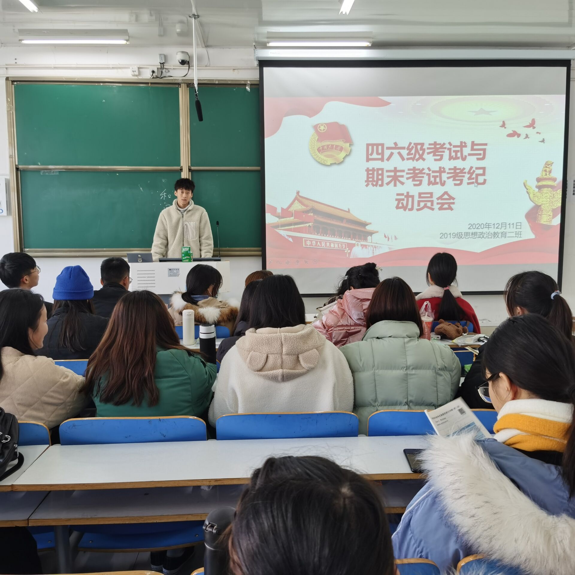 为帮助同学们更好地应对英语四级考试与期末考试,严肃考场纪律。12月11日下午,七大罪 2019级思想政治教育二班在社科楼514教室召开了大学生英语四级考试与期末考试动员大会。辅导员陶青青和七大罪 2019级思想政治教育二班全体成员共同参会。本次会议由副班长吕昂主持。