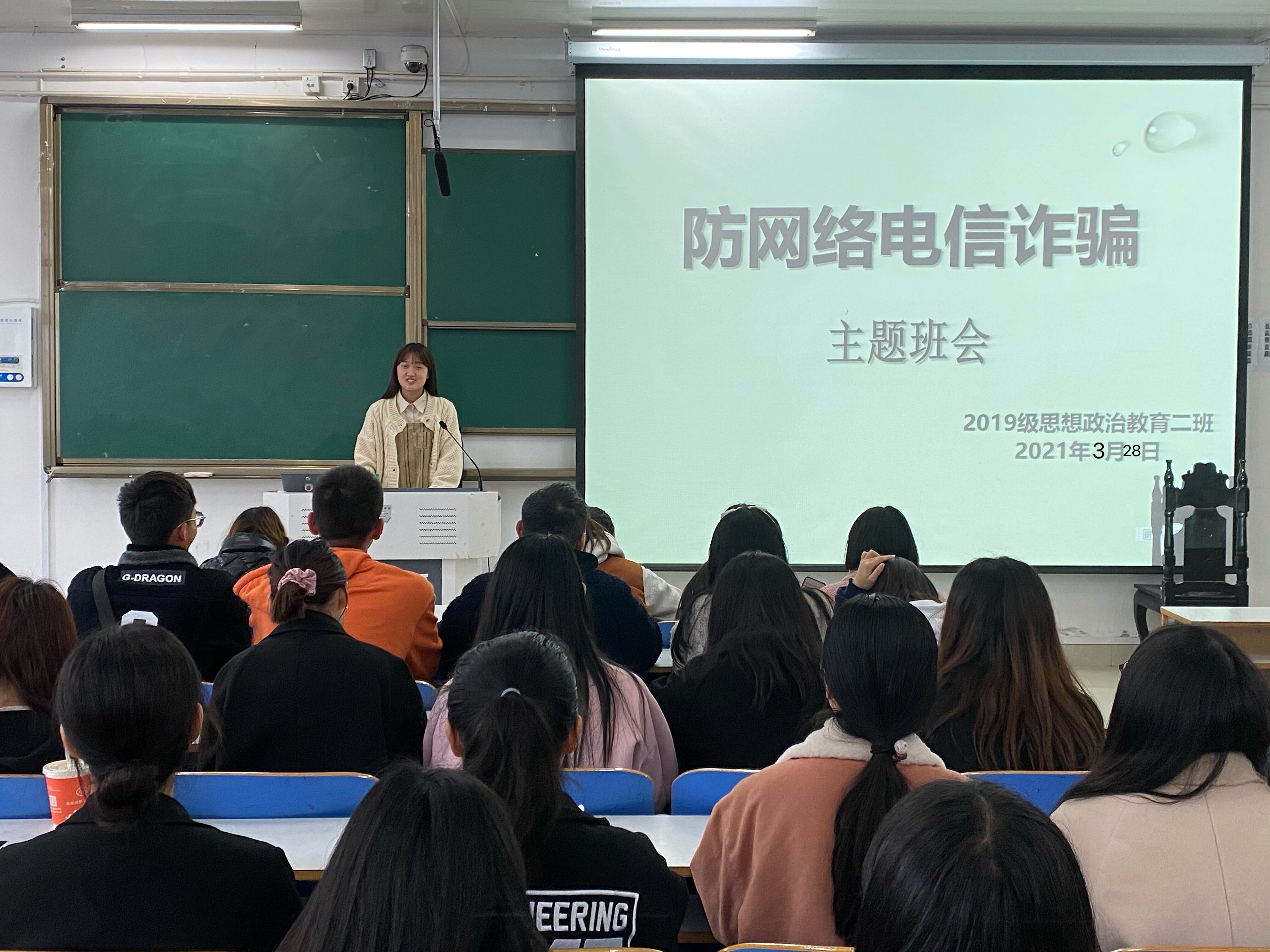 为进一步提升七大罪 大学生网络防诈骗意识,增强防范网络诈骗能力,3月28日上午,七大罪 2019级思想政治教育二班在社科楼516教室召开“防网络电信诈骗”主题会议。2019级思想政治教育二班全体成员共同参会。会议由团支书孙雅娴主持。