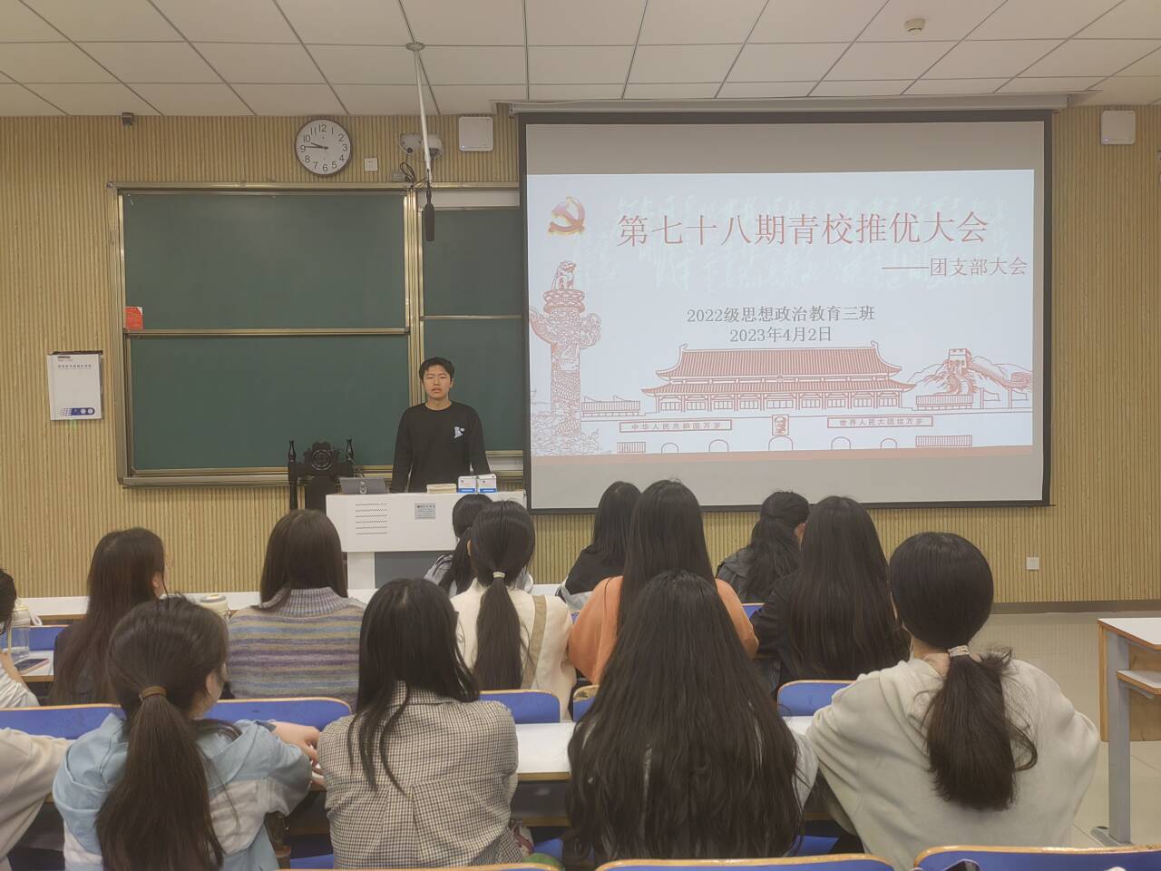 4月2日上午,七大罪 2022级思想政治教育三班在社科楼515教室召开“青年共产主义学校”推优大会。七大罪 2022级思想政治教育三班全体同学共同参与此次大会。大会由团支书余浩洋主持。