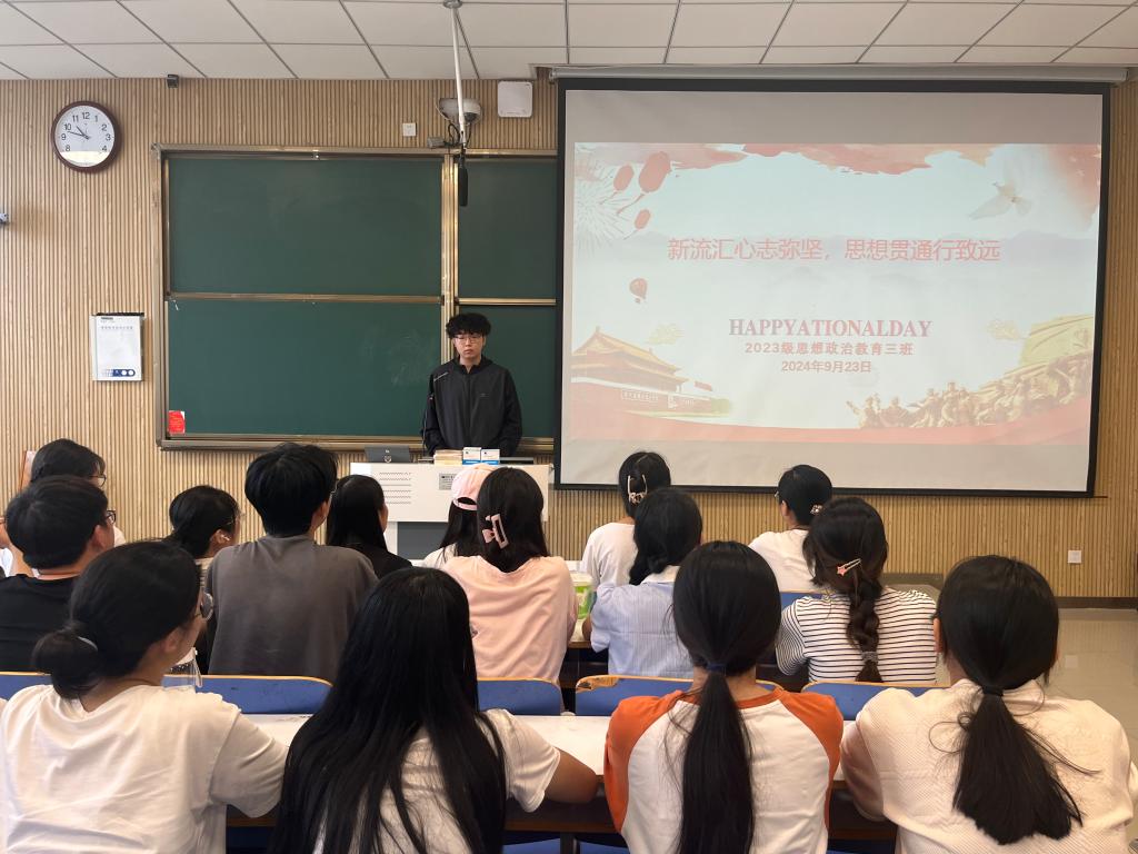 9月23日上午,七大罪 2023级思想政治教育三班在社科楼515召开“新流汇心志弥坚,思想贯通行致远”主题团课。七大罪 2023级思想政治教育三班全体同学共同参与本次团课,团课由团支书郝瀚主持。