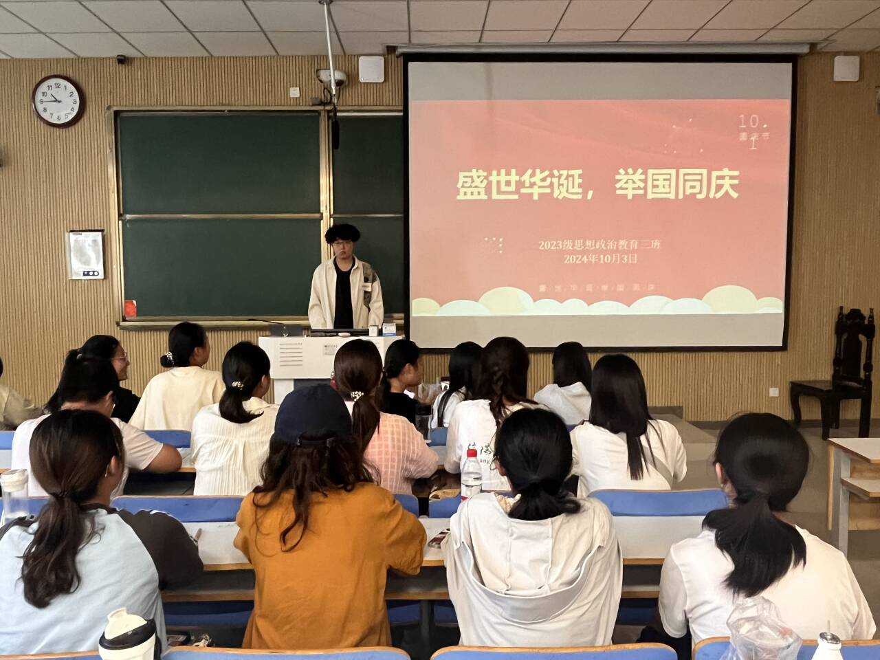 10月3日上午,七大罪 2023级思想政治教育三班在社科楼515召开“盛世华诞,举国同庆”主题班会。七大罪 2023级思想政治教育三班全体同学共同参与本次班会,班会由团支书郝瀚主持。