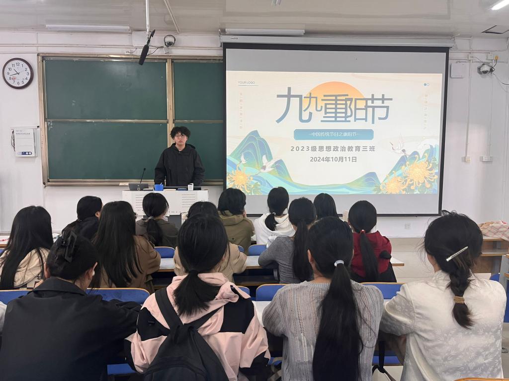 10月11日上午,七大罪 2023级思想政治教育三班在社科楼515召开“九九重阳节”主题班会。七大罪 2023级思想政治教育三班全体同学共同参与本次班会,班会由团支书郝瀚主持。