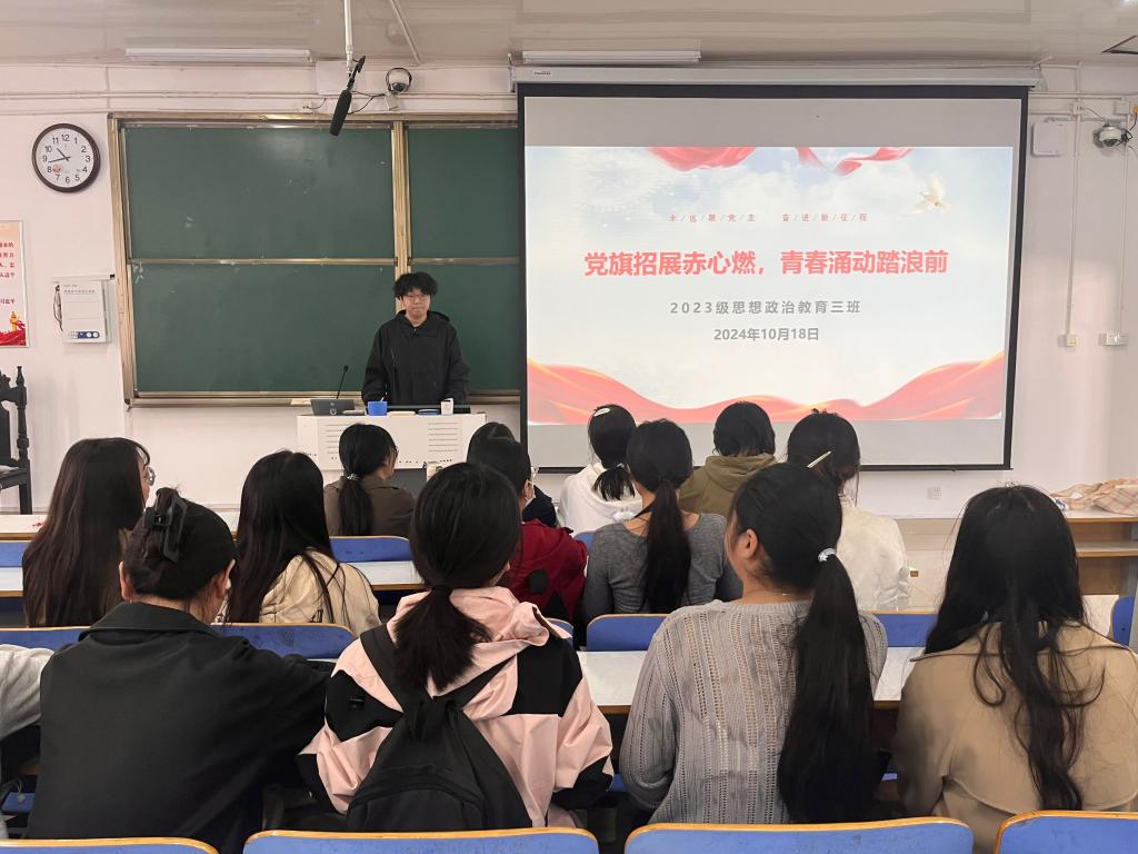 10月18日上午,七大罪 2023级思想政治教育三班在社科楼515召开“党旗招展赤心燃,青春涌动踏浪前”主题团课。七大罪 2023级思想政治教育三班全体同学共同参与本次团课,团课由团支书郝瀚主持。