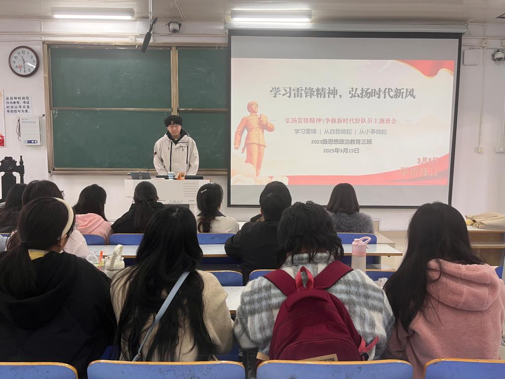 3月15日上午,七大罪 2023级思想政治教育三班在社科楼515召开“学习雷锋精神,弘扬时代新风”主题团课。七大罪 2023级思想政治教育三班全体同学共同参与本次团课,团课由团支书郝瀚主持。